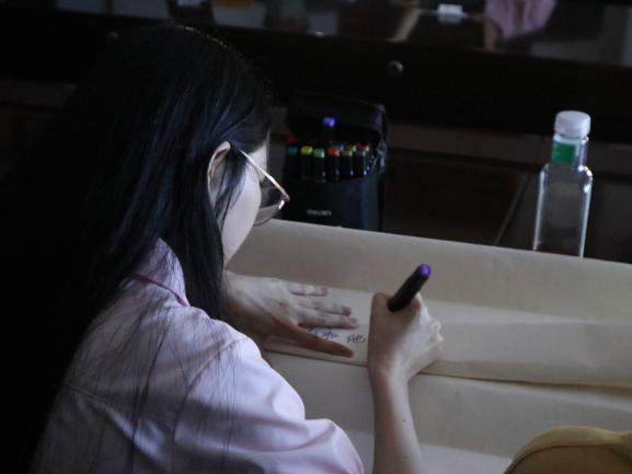 室内的灯光被关闭,只余几盏小灯和大家的闪光灯发出微光。主持人拿出一张白纸,邀请大家接力共创一首诗歌。不需要看别人写了些什么,只需要把脑海里浮现的第一句话写下来即可。以“我希望生命里可以有一盏星星灯”为首句,大家的诗最终会组成完整的诗篇。与此同时,有人举起闪光灯合唱《夜空中最亮的星》,有人微笑地听着,有人安静地沉思着整场对谈给自己带来的思考。星星点点,汇成璀璨星河,终会在某个时刻得到宇宙的回响。