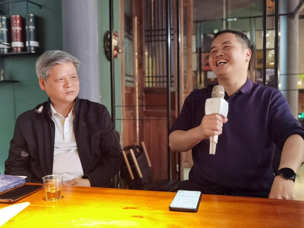 主讲人81级中文系系友、中新社福建分社社长徐德金(左)与《十年建福》责任编辑陈楷根先生(右)畅聊成书点滴
