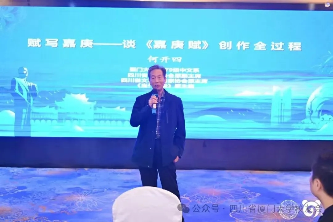 10月,四川省厦门大学校友会缅怀校主陈嘉庚先生暨第九届厦门大学全球校友会会长秘书长暨校友代表大会总结活动在成都圆满举行。四川省厦门大学校友会会长、1987级系友赵越刚致辞,1979级系友何开四教授历时四年创作《嘉庚赋》,并在第九届厦门大学全球校友会会长秘书长暨校友代表大会上发布。中国语言文学系退休教授朱水涌以《陈嘉庚与百年厦大》为题,生动讲述陈嘉庚先生爱国爱乡爱教的光辉人生,系统阐释“嘉庚精神”的文化内涵。