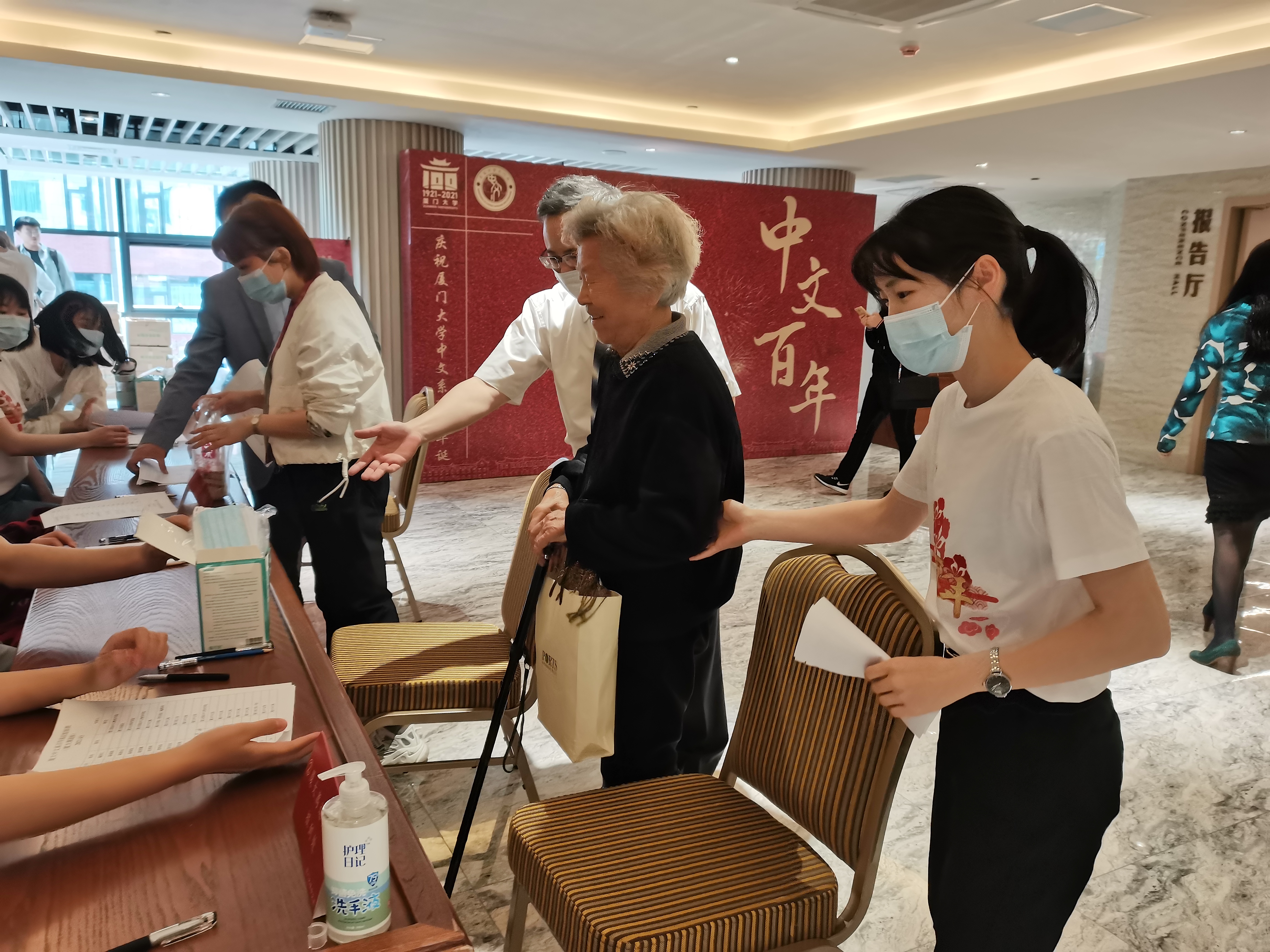 2021年4月6日,厦门大学将迎来百年华诞,创办于1921年的厦门大学中文系,是厦门大学创办最早的院系之一,也将迎来她的百岁生日。中文系于2021年4月5日下午三点,在厦门大学思明校区克立楼三楼报告厅举办以“继往开来,再创辉煌”为主题的中文系百年系庆。下午两点半,与会嘉宾陆续到场,在志愿者的引导下,于报告厅入口领取包含中文系系史等系庆书籍在内的系庆礼袋,并在签名簿上留名、合影,进入会场。会场秩序井然,大屏幕滚动播放纪录片《中文百年》,与会中文系系友、现任教师、退休教师等嘉宾亲切交谈。1960年进入厦门大学中文系、1965年毕业的杨聪凤老师,毕业后留校任教,今已八十二岁高龄,退休二十几年,杨老师仍经常返校交流,关心中文系的发展,体现了中文系系友对母系的热爱。