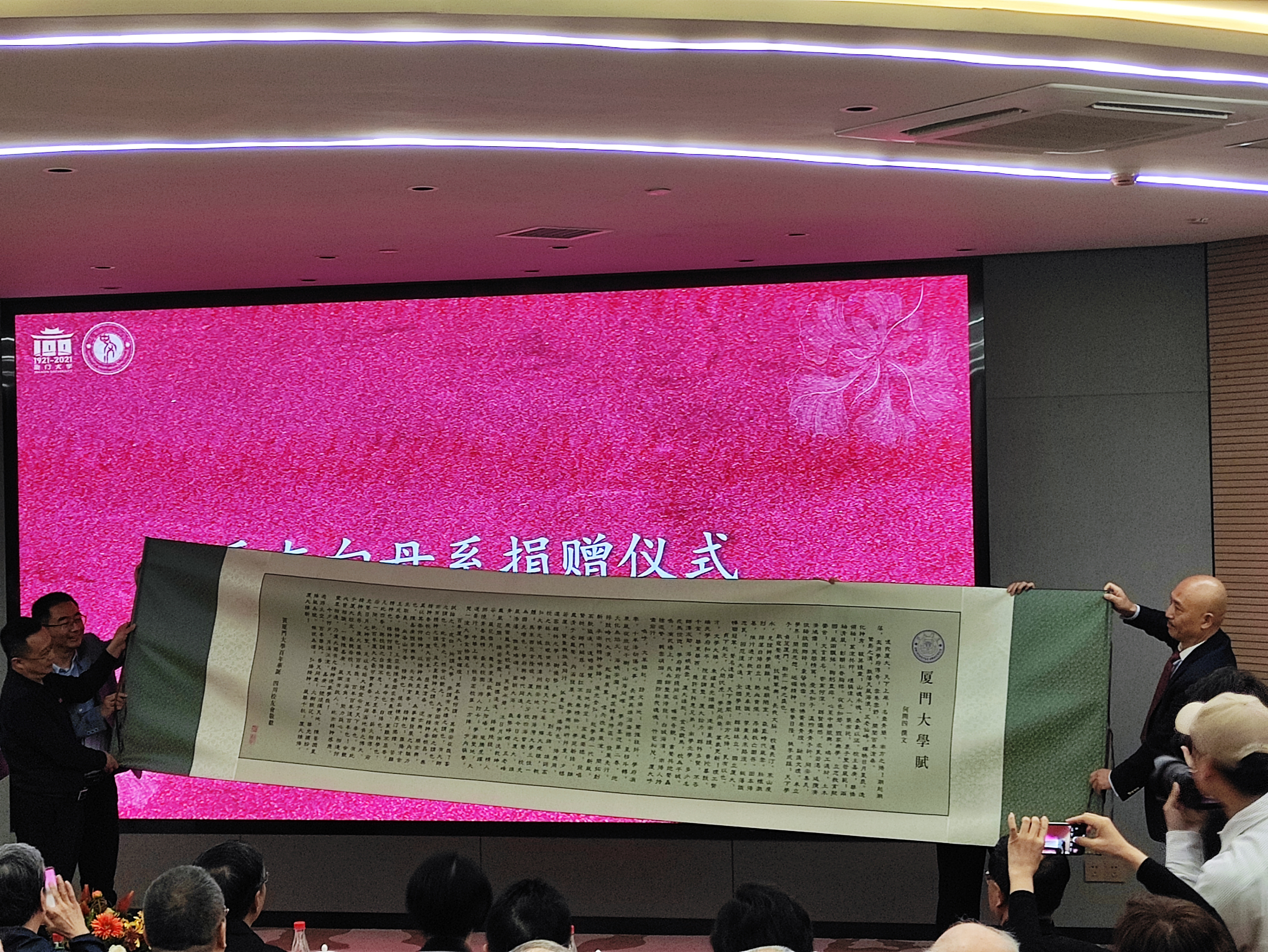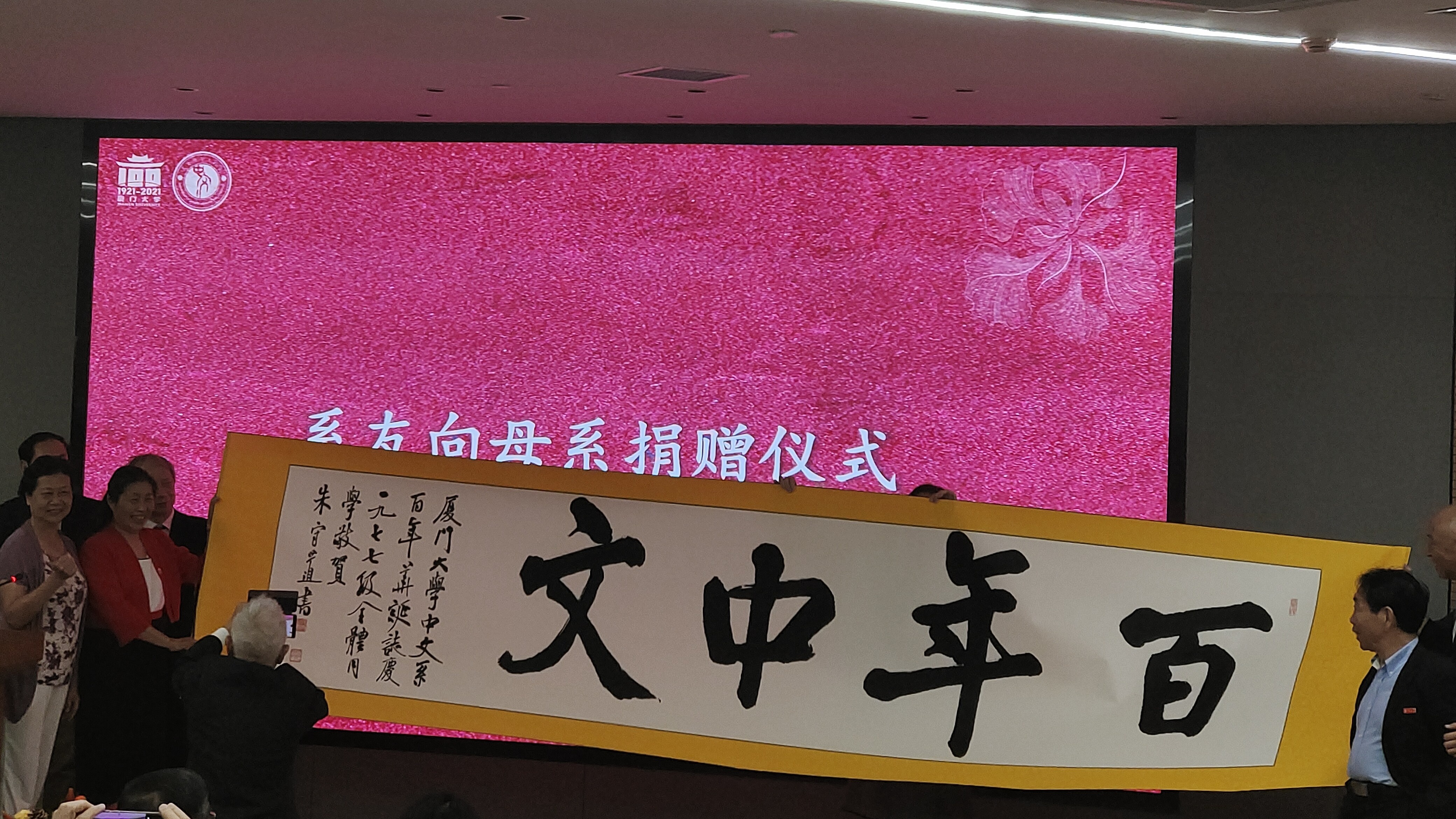 方晓系友代表中文系77级赠送了《鼓浪鹭影》第五集;77级系友书法家朱守道特为中文系百年华诞书写并捐赠了“百年中文”长卷;78级系友书法家潘文海向母系赠送书法作品“春风煦育”;79级研究生何开四系友向母系捐赠《厦大赋》蜀锦作品;厦门大学文学院长汀支教项目——伯湖小学,捐赠了小朋友们集体创作的《长汀客家冬令图》。他们代表了中文系全体系友对母系培养与支持的感恩之情,希望母系开创更加美好的未来。