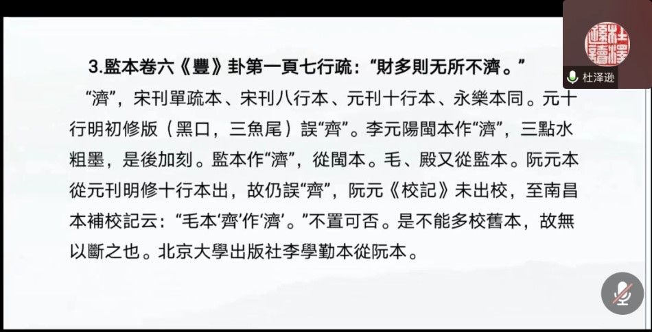 讲座的第二部分,杜老师举以示例,详细说明元福建刻十行本经过明代修版产生的文本嬗递情况。元十行本《周易注疏》存在断版漫漶处,故在明初、明前期、正德六年、正德十二年、嘉靖初年经过多次递修。杜老师从这五个时段切入,依次考察元刊明修十行本的得与失。通过示例可以看出,修版带来的讹误或在经文、或在注疏,或因修版者之误,或因版面受损不易识别。部分讹误为阮元本所延续,而阮氏不出校记,如不能及时厘清,则不利于后续研究。这也正是杜老师组织编纂《十三经注疏汇校》的初衷。