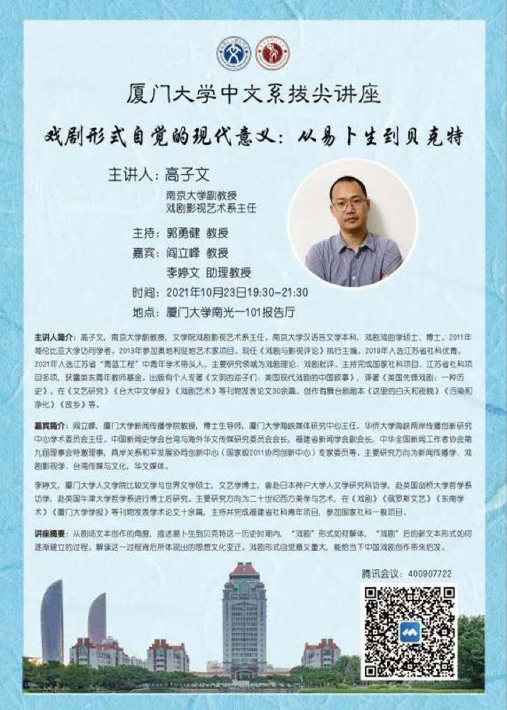 2021年10月23日晚上19:30-21:30,来厦门大学参加“超越与融合:戏剧新趋势国际学术研讨会暨2021年中国话剧理论与历史研究会年会”的南京大学副教授、戏剧影视艺术系主任高子文老师应厦门大学中文系之邀,为中文本科拔尖班、戏文班做题为《戏剧形式自觉的现代意义:从易卜生到贝克特》的专题讲座。