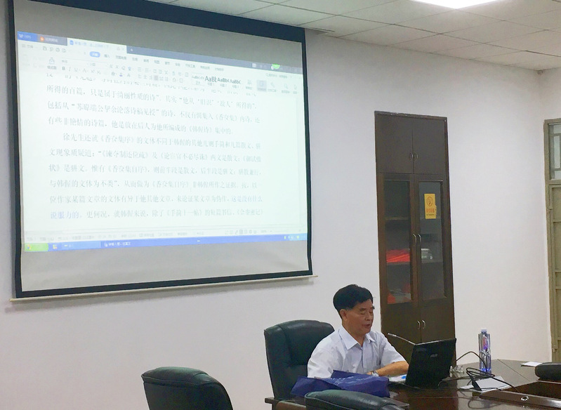 5月15日晚上7点,厦门大学中文系吴在庆教授“审情入理,注重文献之辨析 ——以《香奁集序》非伪作甄辨为例(下)”的学术讲演在人文学院320会议室进行。此次讲演的主要内容是吴教授去年“韩偓< 香奁集序>非一篇假序考辨”讲座的延续。讲座由厦门大学中文系胡旭教授主持,古代文学专业硕、博学生及部分其他专业学生共计三十多人聆听了报告。讲座开始前,胡旭教授详细介绍了吴教授在唐代文学研究,尤其是中晚唐文学研究方面取得的主要学术成果,并充分肯定他为厦大古代文学学科作出的巨大贡献。同时,胡旭教授也对吴教授的到来表示热烈欢迎和衷心感谢。讲座开始后,吴教授简要回顾了上次讲座的观点与论据,紧接着就《袅娜》、《多情》、《春昼》三诗的重见现象与版本收录情况,徐复观先生对《香奁集序》多处的误读,《香奁集》所收诗作风格与文体特征,唐代社会风俗与士人心态五个层面深入展开,涉及到历史、文体、文献、思想史等多个维度。吴教授围绕徐复观先生提出的《香奁集序》为伪作的观点逐一辩驳,或旁征博引各类文献,列举实例,或通过文献细读体会作家情志与文章逻辑,或进行文体辨析,给在座师生以极大启发,体现出吴教授深厚的文献功底与扎实的治学门径。进入评议阶段,胡旭教授发表了对吴教授讲座内容的看法,认为吴教授的考证有理有据,深入浅出,更正了徐复观先生看法的不足。胡旭教授还根据讲座内容,提出了文本细读以及重视文献收集的重要性,并高度赞扬了吴教授严谨、谦和的学者风度。最后,同学们就韩偓《残花》诗系年、《见花》所反映出的作者情志以及韩偓手简的文学价值等诸多问题与吴教授进行了热烈交流与互动。