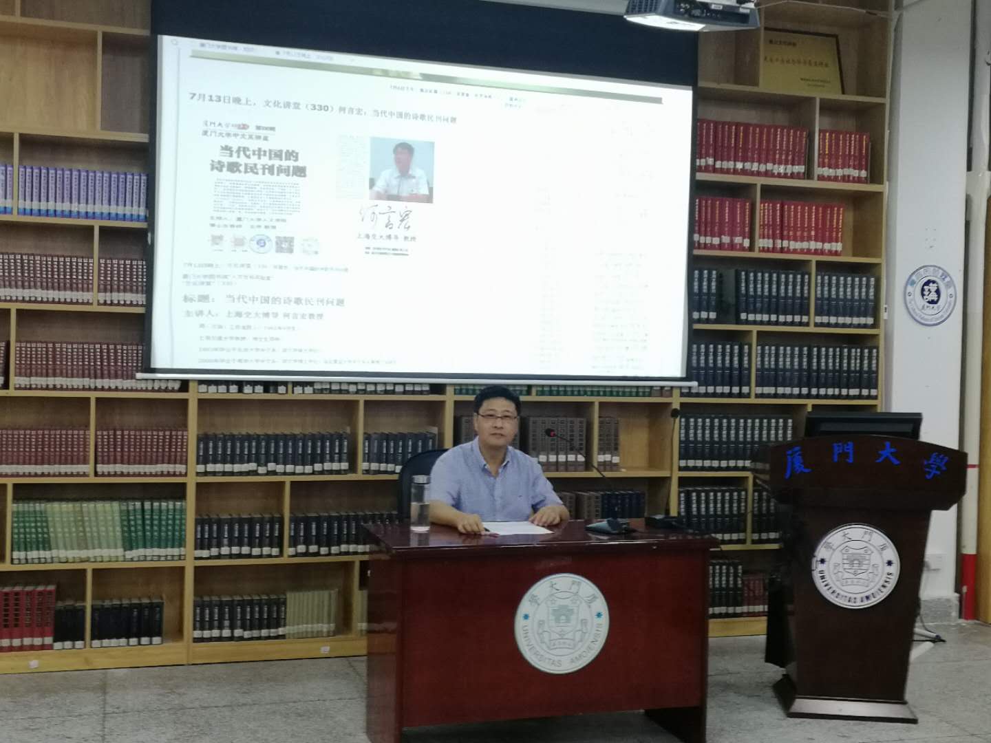 2018年7月13日晚7点,应厦门大学中文系邀请,上海交通大学教授,博士生导师,现当代文学领域著名学者何言宏教授莅临我校,在厦门大学图书馆323区域研究资料中心举办了题为“当代中国的诗歌民刊问题”的讲座。讲座由厦门大学中文系博士生导师王宇教授主持,中文系相关专业的师生及其他诗歌爱好者参与了此次讲座。