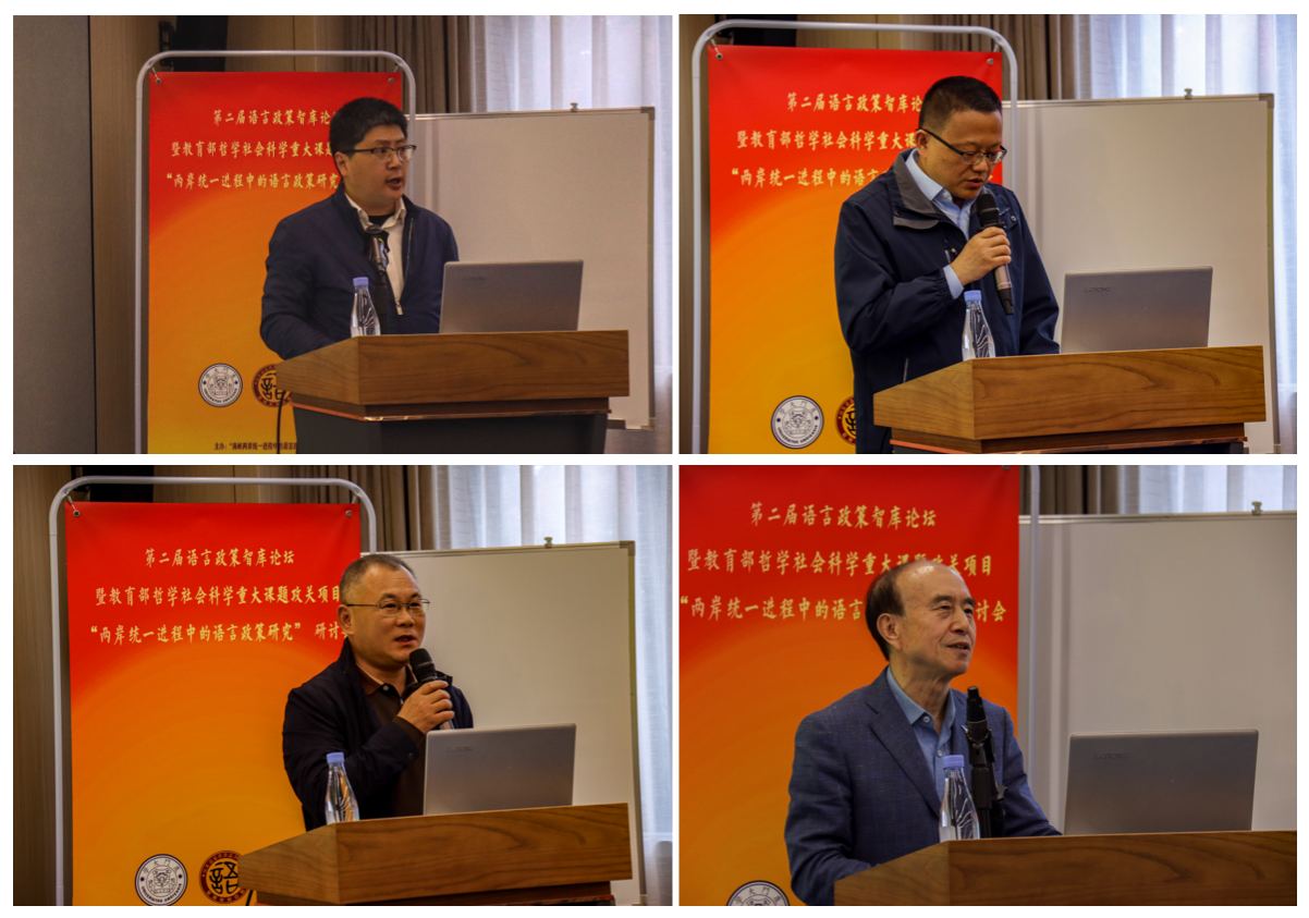 本届会议共有32篇论文报告,分为四场大会报告、二场分会场报告依次进行,与会代表聚焦两岸统一进程中的语言政策研究、语言生活研究、语言政策铸牢中华民族共同体意识研究、国家语言治理体系与语言规划研究等主题进行了深入探讨与交流。代表们分别从观察者、学者实践者、谏言者三个视角出发,对语言生活涉及的多个领域、语言教育的全部领域、语言政策作为材料和策略的两个定位聚焦,体现了当前语言政策智库研究立足观察、着力实践、探索谏言的研究趋势。本届论坛的研究还体现出指向当下、指向未来的突出特点,在对当前国家通用语言文字在民族地区的推广与应用集中关照、对当前台湾语言生活、语言教育和语言政策重点关照的前提下,面向未来探讨国家通用语言文字政策的执行效果、探讨两岸统一进程中语言政策的策略研究。第二届语言政策智库论坛还就语言政策智库研究的背景、理论、方法、价值与实践的研究系统角度进行探讨。