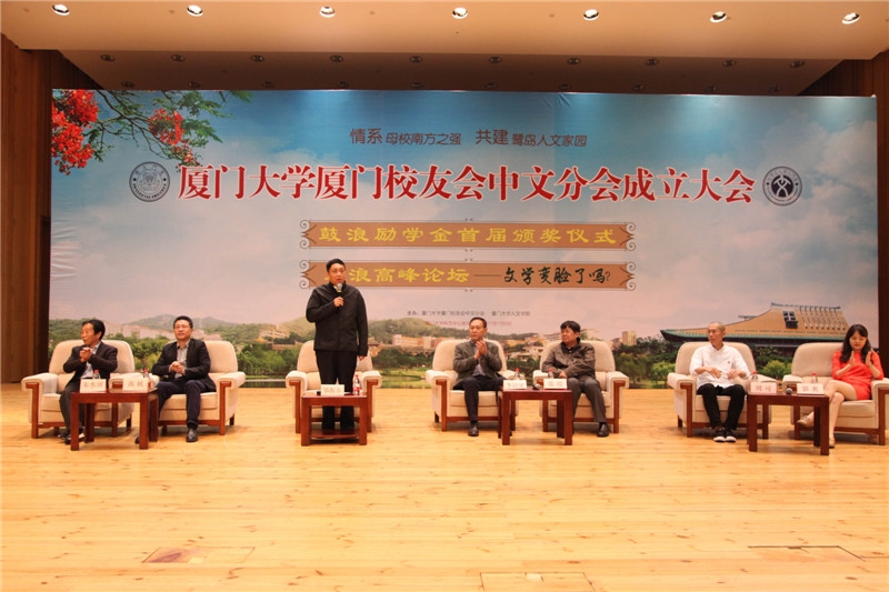 此外,继厦门大学厦门校友会中文分会成立大会结束后举办的“鼓浪高峰论坛”是当天活动的另一大亮点。此次论坛由新闻传播学院特聘教授邹振东主持,本次论坛汇聚了福建省政协副主席、省文联主席、省社科院院长、教授、著名作家、文学评论家南帆,厦门大学中文系教授、著名文学评论家朱水涌,金庸秘书,著名金庸研究专家、文学评论家李以建,著名文学评论家张陵,华南理工大学教师、《新周刊》杂志副主编、新周刊(广州)新媒体发展有限公司执行总裁周可以及著名作家郭爽等多位文坛大咖。这些中文系校友围绕“文学变脸了吗”这一主题,从诺贝尔文学奖说起,探讨了当代文学的新变化、大学尤其是中文系是否以培养作家为目标、作家与金钱之间的关系、中文系是否依然会存在等问题。论坛嘉宾时而成竹在胸、高谈论阔,时而若有所思、娓娓而谈,时而妙语连珠、语惊四座,各嘉宾对文学与人生的理解,引发校友对文学的深刻思考。这场关于文学主题的论坛在新年之际注定是一场震撼心灵的文学盛宴,也必将为文学的世界打开一扇更加明媚的希望之窗。