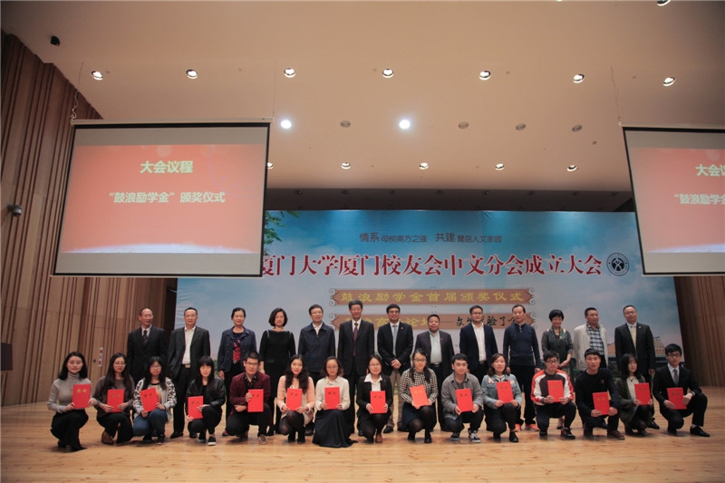 本次大会还创立了 “鼓浪励学金”。中文系系主任李无未教授代表中文系接受捐赠,教育发展基金会办公室副主任赵晓慧为校友代表颁发捐赠证书。2014级中文系本科生孙培婷等15位学生及团体成为首届获得者。系友代表黄毓斌等为他们颁发荣誉证书。“鼓浪励学金”是由中文系校友自主发起的助学善意行动,它缘起于95周年校庆期间,旨在支持厦门大学人文学院教育事业的发展,促进在创新、创作、创业、访学交流、志愿服务等方面表现优异的学生成长成才。这是首次以院系各年级为单位发起和设立的励学金基金,首期由中文系1977级至1990级14个年级的校友共同发起设立。