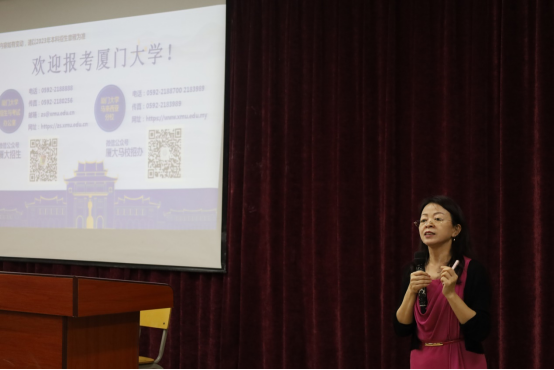 黄宇霞做“中国南方之强 山海花园学府”宣讲,围绕“厦门大学是所怎样的学校?”“厦门大学学习有怎样的体验?”“厦门大学毕业生发展怎样?”“怎样进入厦门大学学习?”等四个问题,全方位给在场师生展示立体的厦门大学,增进了师生对厦门大学的认识与了解。