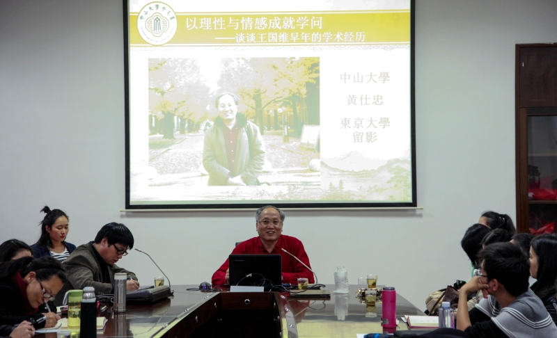 2016年12月16日星期五晚上,人文学院320会议室,中山大学中文系教授、中国古籍文献研究所所长黄仕忠先生为我系师生带来一场题为“以理性与情感成就学问——谈谈王国维早年的学术经历”的学术讲座。讲座由我系胡旭教授主持。本次讲座吸引了众多师生前来聆听,一时间座无虚席。