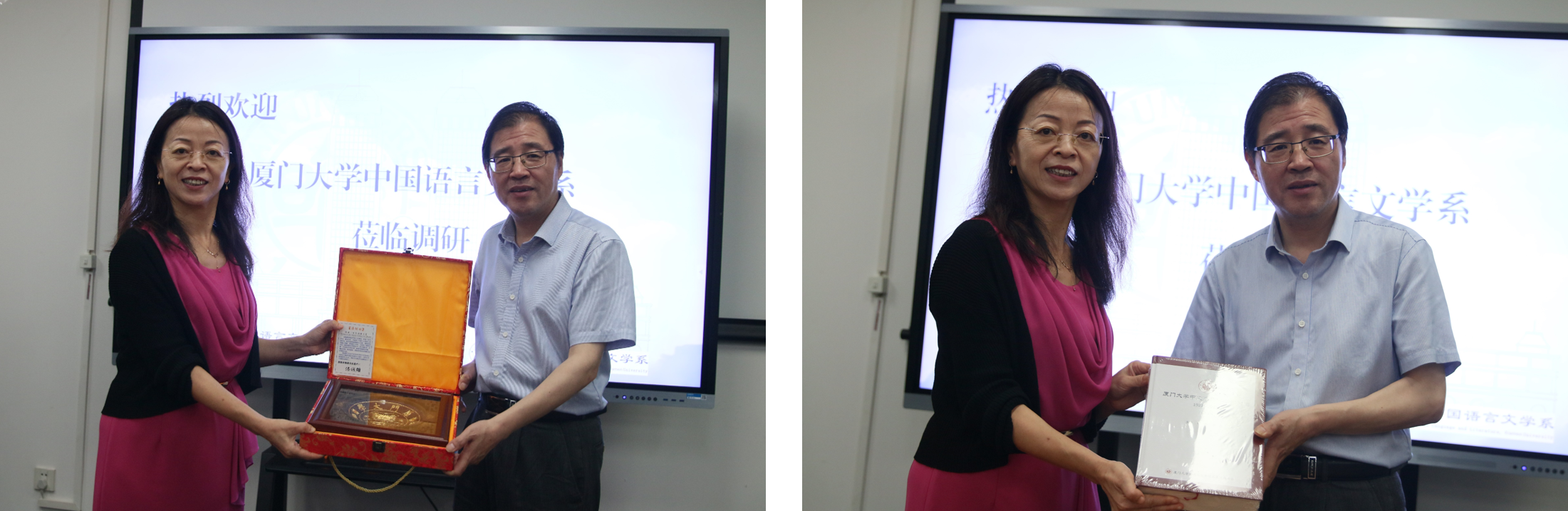 会后,黄宇霞代表厦门大学中文系向复旦大学中文系赠送了“国家级非物质文化遗产厦门漆线雕作品和《厦门大学中文系百年系庆学术文选》。调研团队参观了复旦大学中文系资料室、文化墙。
