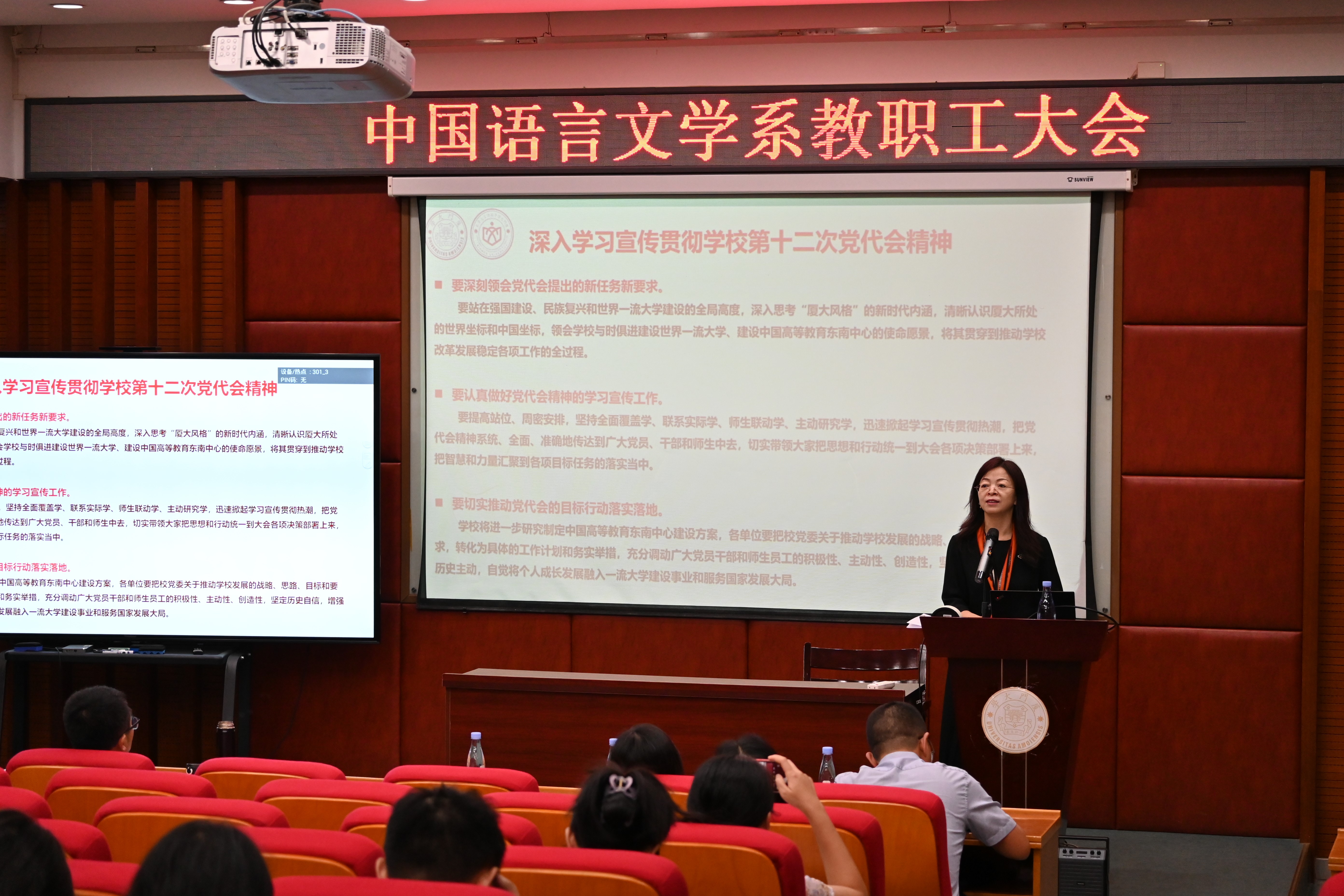 10月12日下午,厦门大学中国语言文学系教职工大会于南光楼101报告厅举行。大会由系副主任李焱教授主持,系领导班子和全体教职工参加会议。