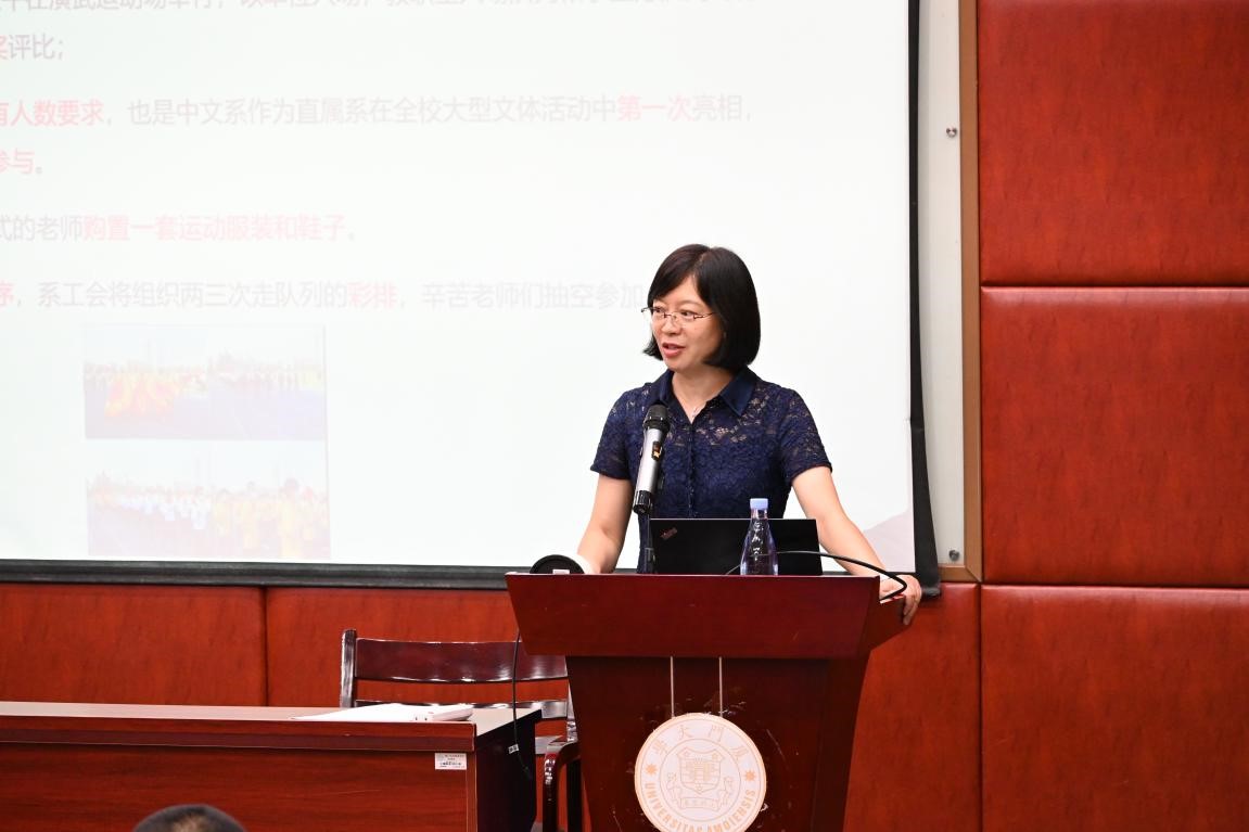 黄宇霞传达学校2023年秋季学期工作布置会的主要精神,就与中文学科发展相关的要求做重点布置。她指出,下半年我们要扎实推进党建和思想政治工作再深化、再提升,开展教师评价体系改革,做好本科教学审核评估和科研项目组织申报等相关工作。