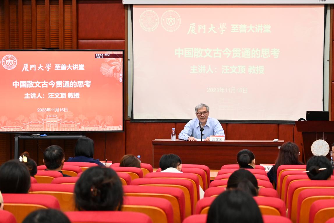 2023年11月16日下午,福建师范大学文学院教授、博导,曾任福建师范大学副校长、中国现代文学研究会副会长、中国散文学会常务理事的汪文顶教授受中国语言文学系之邀,在思明校区南光一101报告厅举行题为“中国散文古今贯通的思考”的精彩讲座。本次讲座由中国语言文学系副主任徐勇教授主持,中国语言文学系党委书记黄宇霞、中国语言文学系党委副书记葛学凤、中国语言文学系苏琼教授出席,中国语言文学系本、硕、博学生到场聆听。