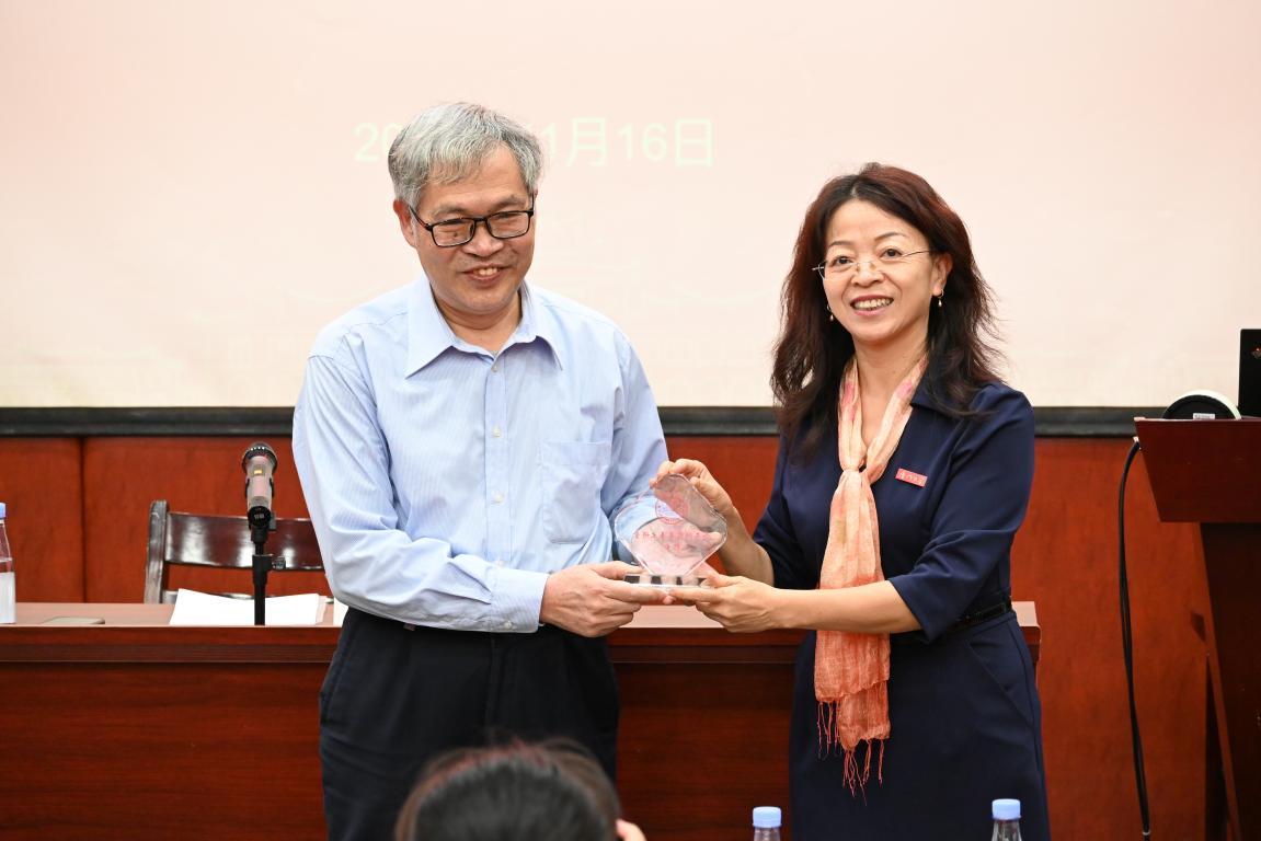 讲座开始前,黄宇霞为汪文顶颁发“人文社科至善大讲堂”纪念牌。