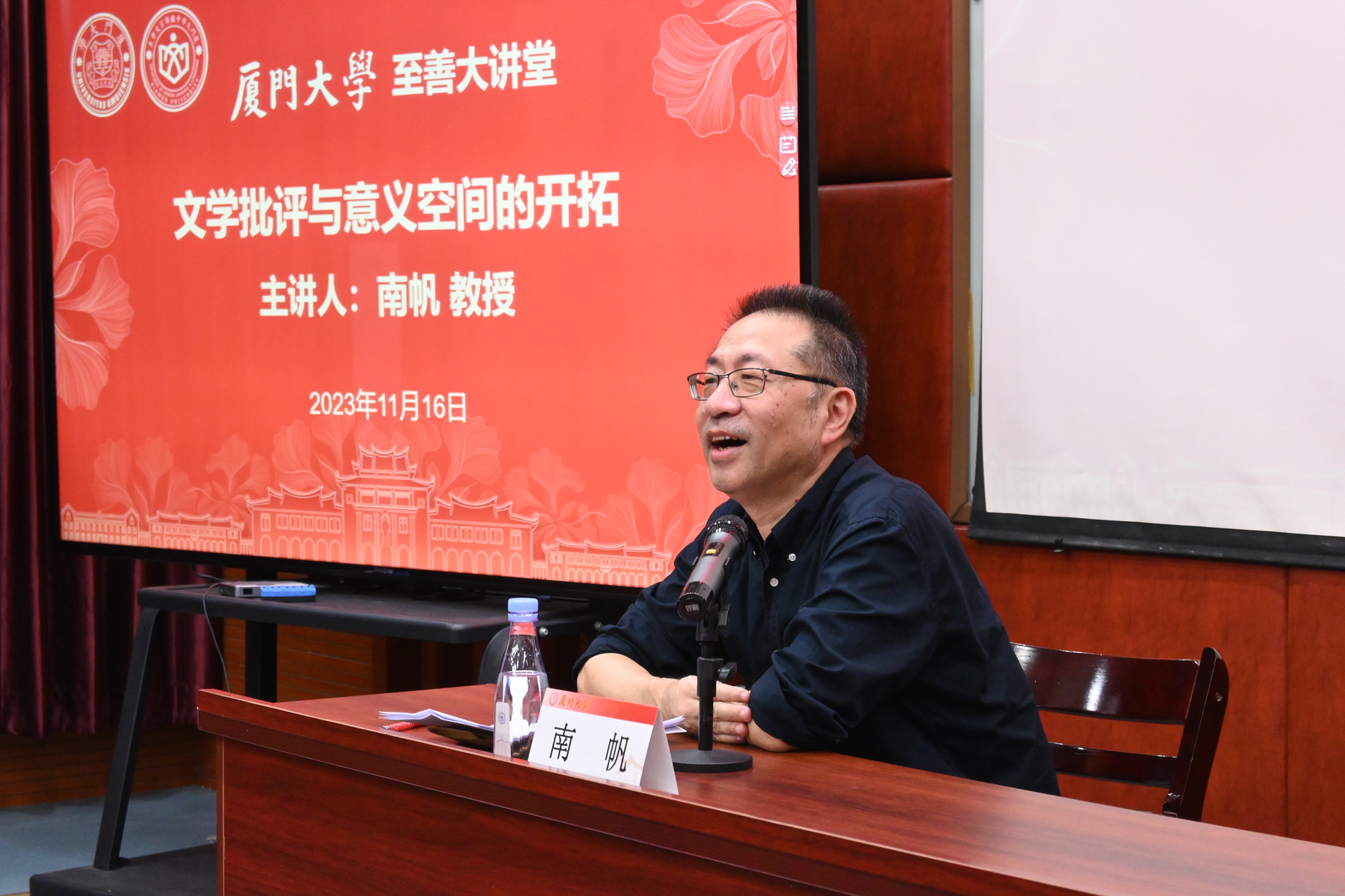 2023年11月16日下午,福建社会科学院原院长,福建省文联主席,福建师范大学“闽江学者”特聘教授、博士生导师,中国文艺理论学会会长,中国作家协会理论委员会主任,著名作家南帆受厦门大学中文系之邀,在思明校区南光一101报告厅举行题为“文学批评与意义空间”的精彩讲座。本次讲座是厦门大学人文社科至善大讲堂系列第96讲,由厦门大学中国语言文学系副主任徐勇教授主持,中国语言文学系党委书记黄宇霞、中国语言文学系党委副书记葛学凤、中国语言文学系苏琼教授、电影学院郑国庆教授出席,中国语言文学系本、硕、博百余名学生到场聆听。
