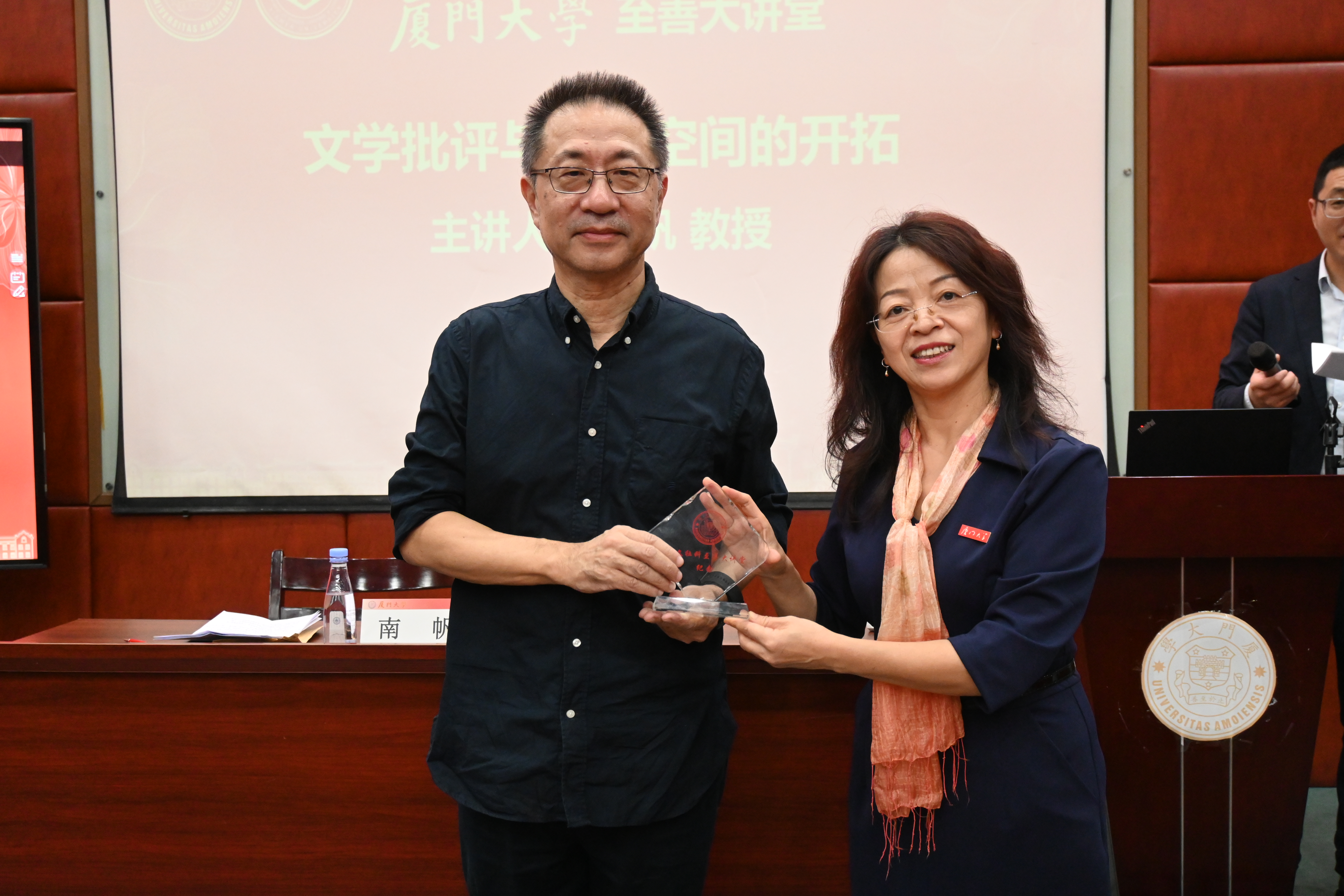 讲座开始前,黄宇霞为南帆颁发“人文社科至善大讲堂”纪念牌。