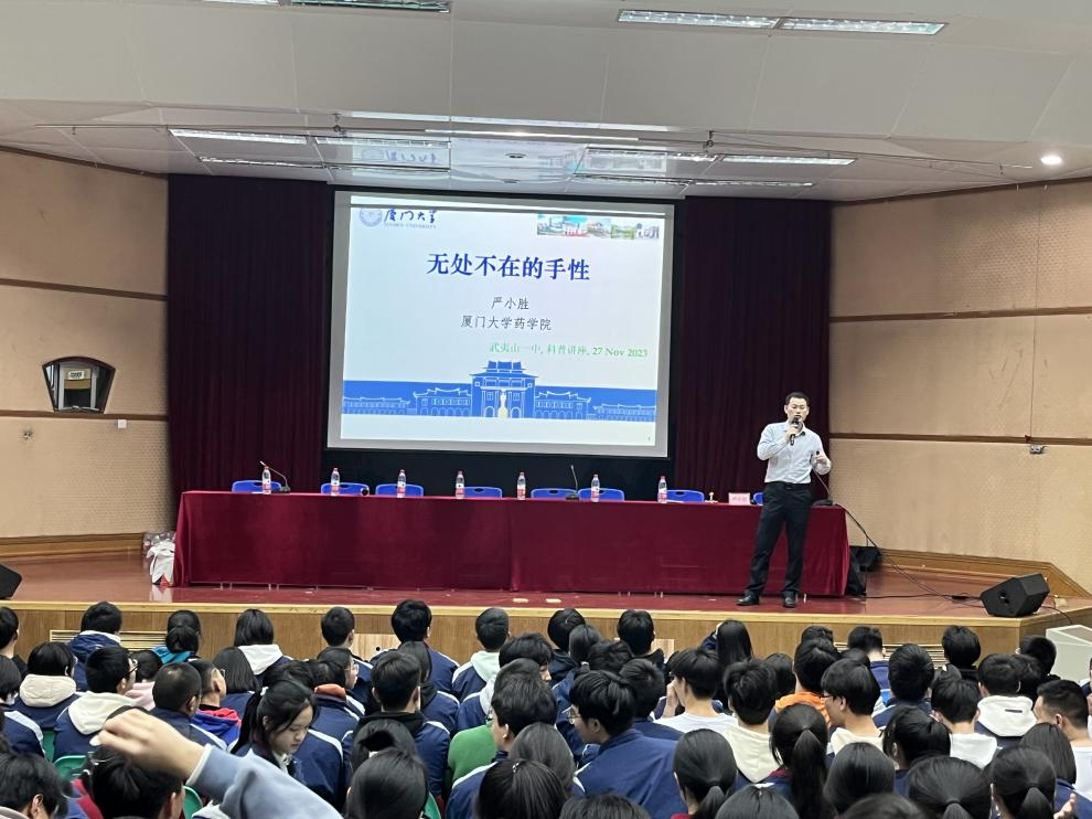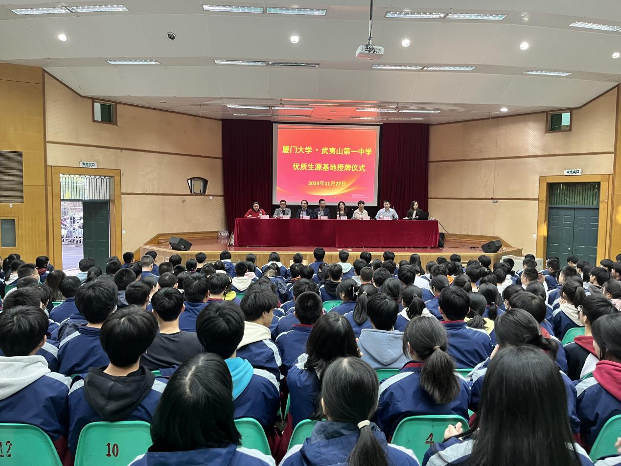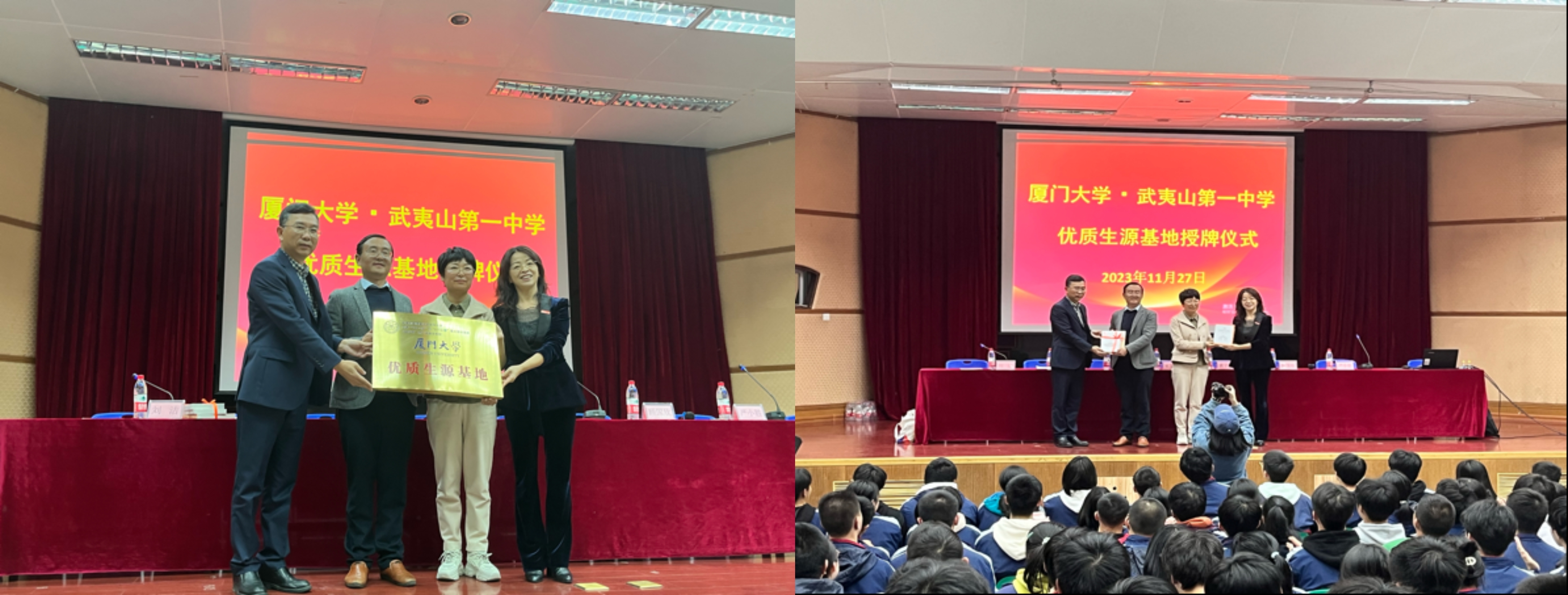 11月27日,厦门大学南平招生宣传组中国语言文学系党委书记黄宇霞,药学院党委书记宋友良、副院长朱铉等一行赴武夷山第一中学开展招生宣讲、“教授进中学”科普讲座和优质生源基地授牌活动。武夷山第一中学党委书记顾国欣、校长暨洪彪等参加了活动,活动由一中副校长刘洁主持。