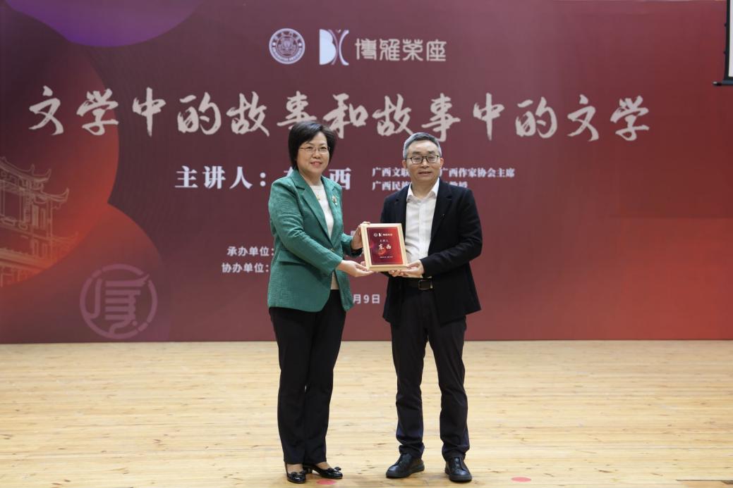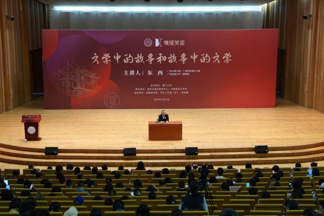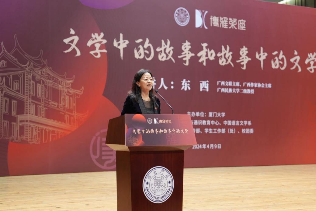 2024年4月9日下午,第十一届茅盾文学奖得主、广西文联主席、广西作家协会主席、广西民族大学二级教授东西应邀来到厦门大学,在思明校区科学艺术中心为师生们带来一场“文学中的故事与故事中的文学”的精彩讲座。厦门大学党委常委、副校长邓朝晖出席讲座。讲座由中国语言文学系党委书记黄宇霞主持。