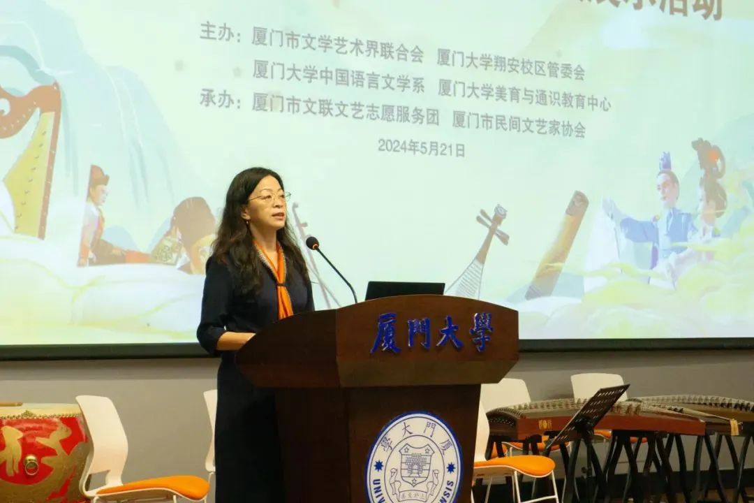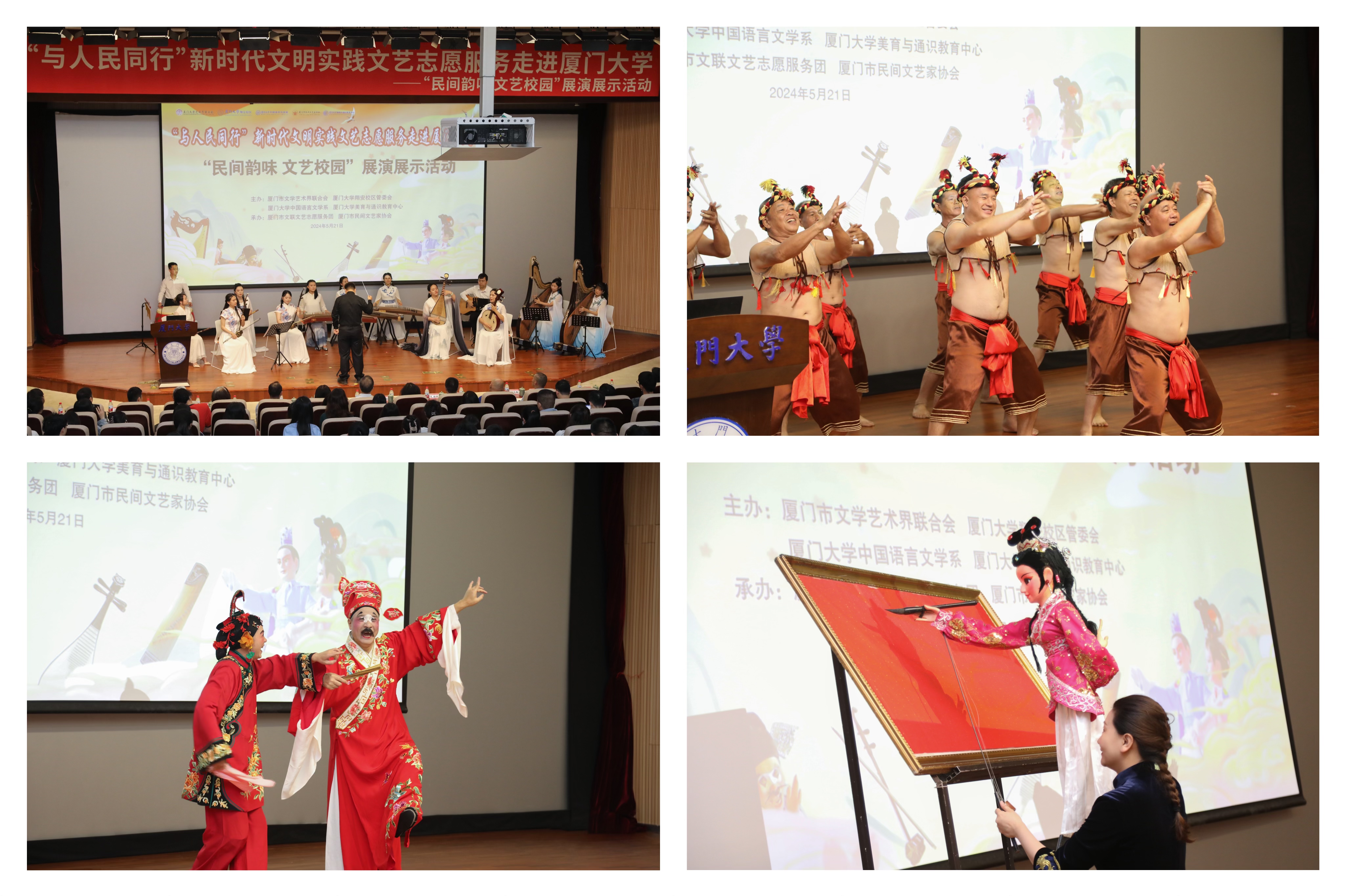 为深入学习贯彻习近平新时代中国特色社会主义思想和党的二十大精神,深入学习贯彻习近平文化思想,在毛泽东同志《在延安文艺座谈会上的讲话》发表82周年、第11个中国文艺志愿者服务日来临之际,为弘扬和践行社会主义核心价值观,打造“文艺名家工作室”品牌,进一步丰富大学校园文化生活,推进人文校园建设,5月21日上午,厦门大学中国语言文学系携手厦门市文学艺术界联合会、厦门市民间文艺家协会于翔安校区德旺图书馆举办了“与人民同行”新时代文明实践文艺志愿服务走进厦门大学——“民间韵味 文艺校园”展演展示活动。