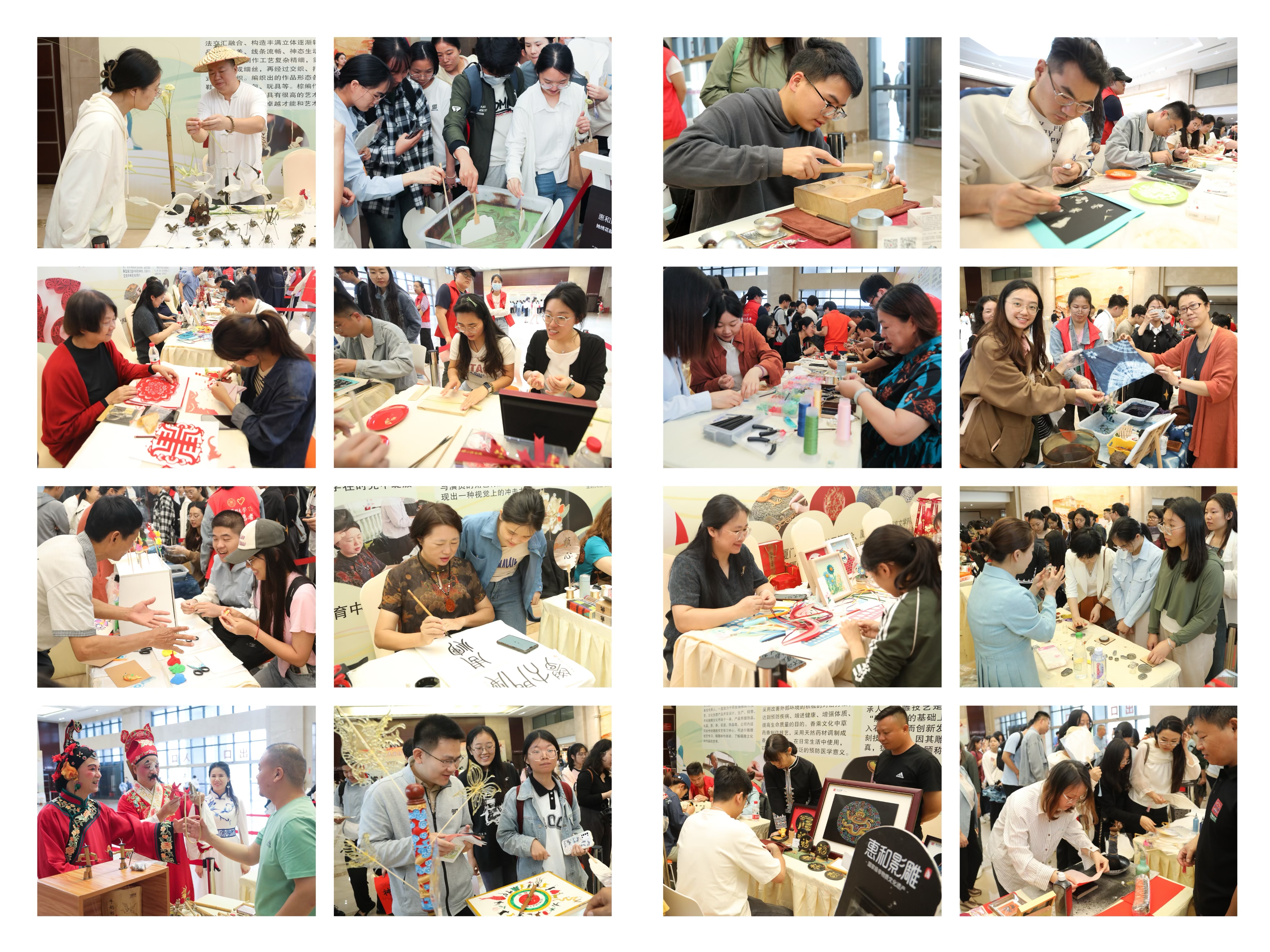 开幕式后,民间工艺展示市集在德旺图书馆北厅举行,棕编、剪纸、扎染、衍纸、面塑、锡雕、糖画、制香、影雕、漆扇、年画、漆线雕、闽南童玩、鱼骨艺术、趣玩汉字、戏曲头饰技艺等16个摊位吸引师生流连驻足、动手尝试,每个摊位都有专业民间艺术工作者的耐心指导,其中包括中国非遗艺术设计研究院特聘研究员、厦门民间文艺家协会秘书长王鹭鹰,福建漆艺传承人、福建省工艺美术师沈锦丽以及省级非遗传承人颜朝俊、郑天泗、王守萍、安海燕等众多文艺名家。