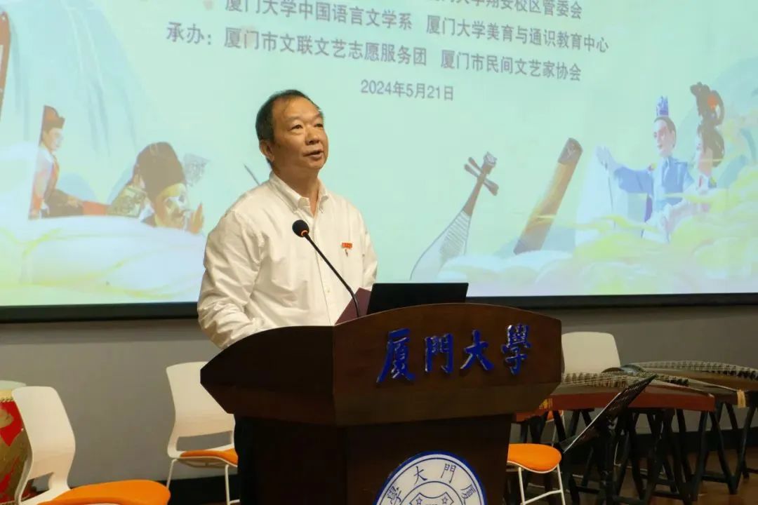 陈光在致辞中指出,本次活动用青年喜闻乐见的形式让学生近距离体验传统文艺,旨在进一步激发学生对中华优秀传统文化的兴趣与热爱,增强高校师生文化自觉和文化自信,更好地担负起在文化传承创新的使命。希望各方继续加强合作交流,持续开展精品校园文化活动、营造良好校园文化生态,以优秀传统文化涵育优秀人才,把每个厦大人都培养成中华优秀传统文化的传承者、传播者、创新者,为推进文化自信自强,铸就社会主义文化新辉煌贡献厦大力量。