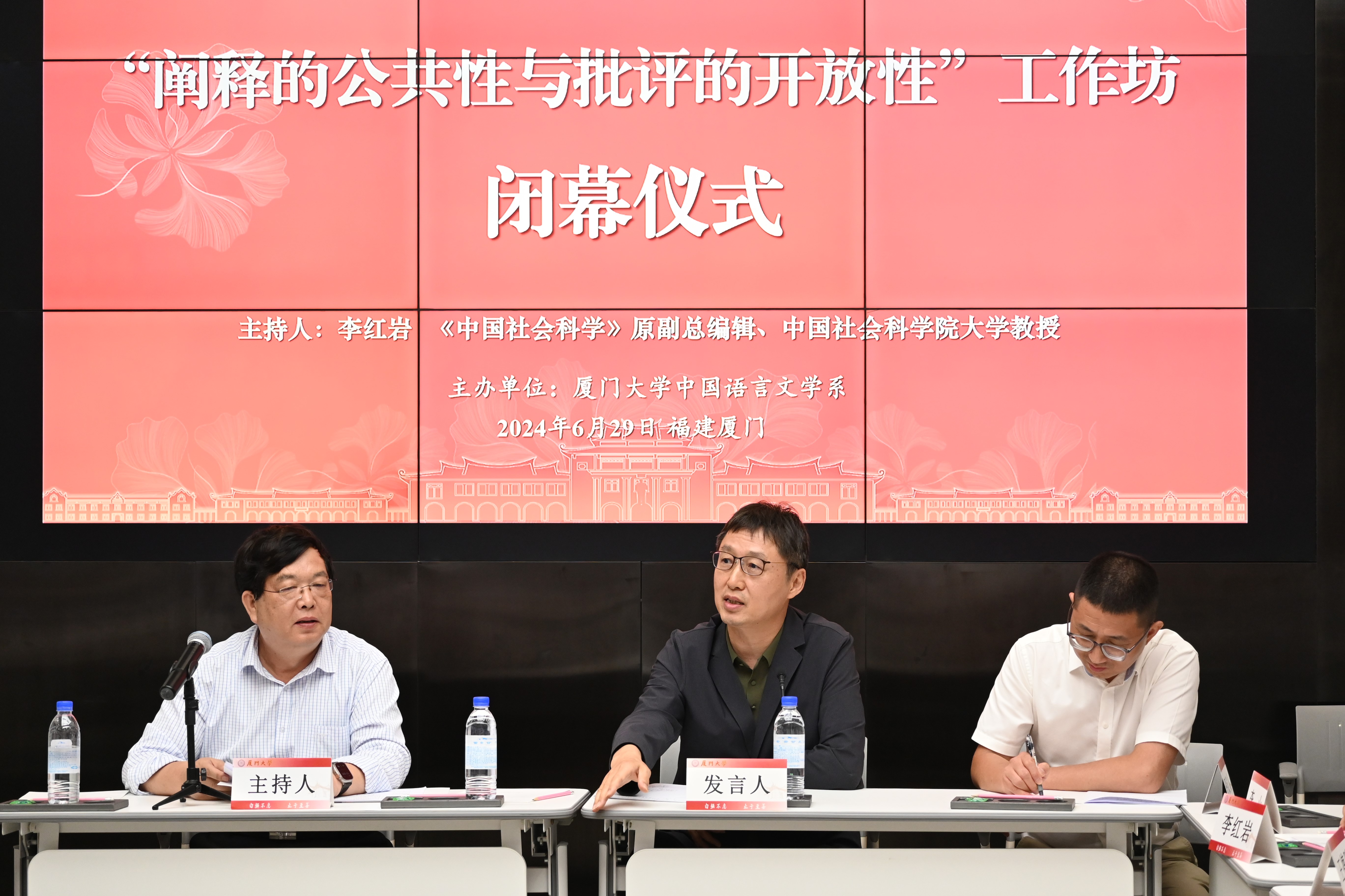 6月29日,“阐释的公共性与批评的开放性”工作坊在福建厦门顺利举行。中国社科院大学阐释学高等研究院院长、《中国文学批评》杂志主编、原中国社会科学院副院长张江,福建省社科院研究员、厦门大学中国语言文学系杰出系友南帆,《中国社会科学》原副总编辑、中国社会科学院大学教授李红岩,福建省社科联党组成员、副主席,《东南学术》杂志社社长、总编辑郑东育,厦门大学党委副书记、纪委书记全海,吉林大学哲学社会科学资深教授、长江学者特聘教授张福贵,北京大学中国语言文学系教授、长江学者特聘教授陈晓明,苏州大学文学院教授、长江学者特聘教授王尧,上海交通大学人文学院教授、院长、长江学者特聘教授吴俊,杭州师范大学人文学院教授、院长洪治纲,首都师范大学艺术学部主任、艺术与美育研究院院长、教授王德胜,南京师范大学文学院教授何平,北京师范大学文学院教授李山,山东大学威海校区文化传播学院教授张红军(泓峻),吉林大学文学院教授张涛,中山大学中文系教授郭冰茹,厦门大学哲学系主任、长江学者特聘教授朱菁,重要学术期刊代表,以及厦门大学中国语言文学系部分师生等出席会议。开幕式由厦门大学中国语言文学系党委书记黄宇霞主持。