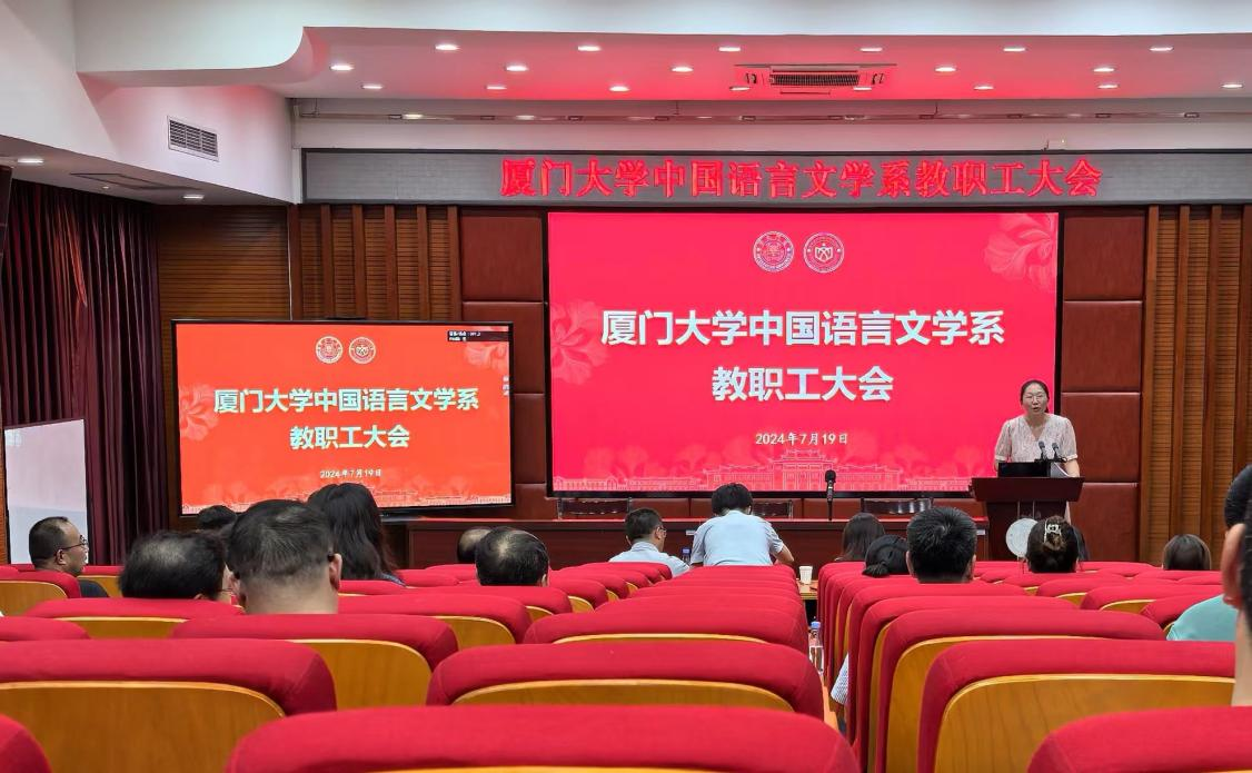 7月19日下午,厦门大学中国语言文学系教职工大会于南光楼101报告厅召开,系领导班子和全体教职工参加会议。会议由系办公室主任哈飞飞主持。