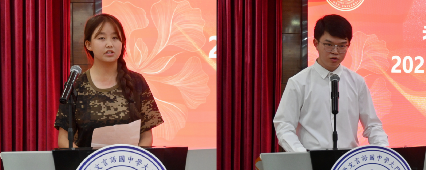 在校生代表 2023 级汉语言文字学专业硕士生罗钰鸣以自身经历鼓励新生们深耕学业,善用院系资源,勇于创新,发掘潜力,用实际行动去诠释新时代青年的责任与担当,在这片充满希望的土地上找到属于自己的舞台,展现青春的风采与力量。