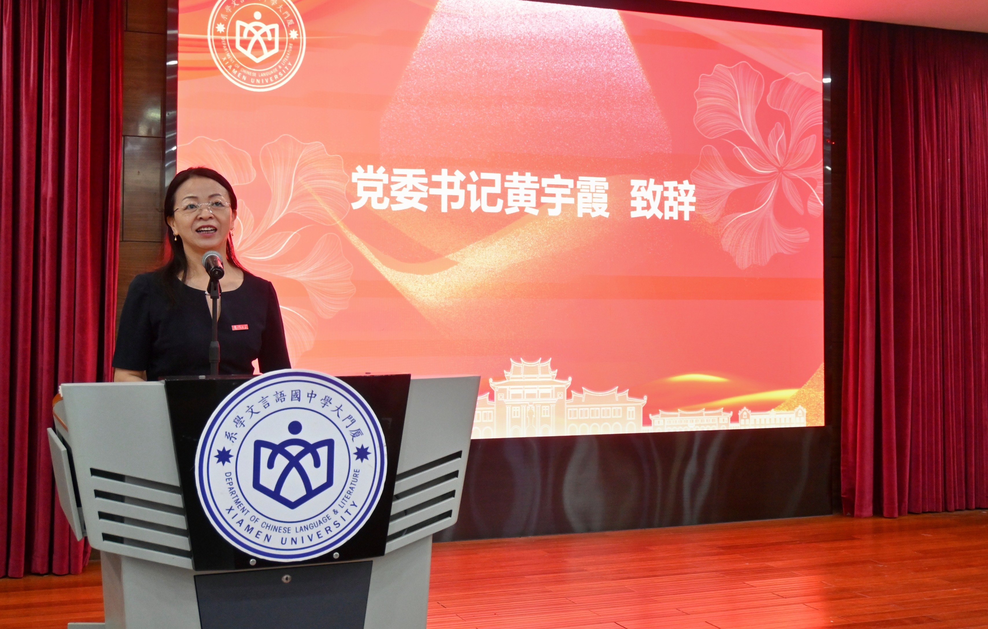 系党委书记黄宇霞代表全体师生员工对新同学的到来表示热烈的欢迎与衷心的祝贺,期待新同学们在厦门大学中文系开启一段全新的人生旅程。她从厦大的百年风霜与百年荣光出发,与新同学们共勉三个词:守正,创新,笃行。守正,是厦大中文人的底气,是陈嘉庚先生与林文庆先生“本校首重国文”的高度共识,在学术沃土中深耕,坚守厦大中文的优秀传统,赓续中华文脉蕴含的智慧和力量,是每一位学子的责任与使命;创新,是对同学们深切的期盼与能力的要求,无数中文系专家学者推陈出新,先声夺人,首创新篇,清晰地彰显着中文学科强大的创新优势,希望同学们敢于创新,善于创新;笃行,是踏踏实实,坚持不懈,更是奋发图强,尽善尽美,蕴含对全体新生学习中文先贤,汲取学科优势,把握机会,奋发有为,履践致远的殷切希望。最后,黄宇霞衷心祝愿每一位新生都能在经典里找到自我,在文字里编织梦想,遇见更好的自己。