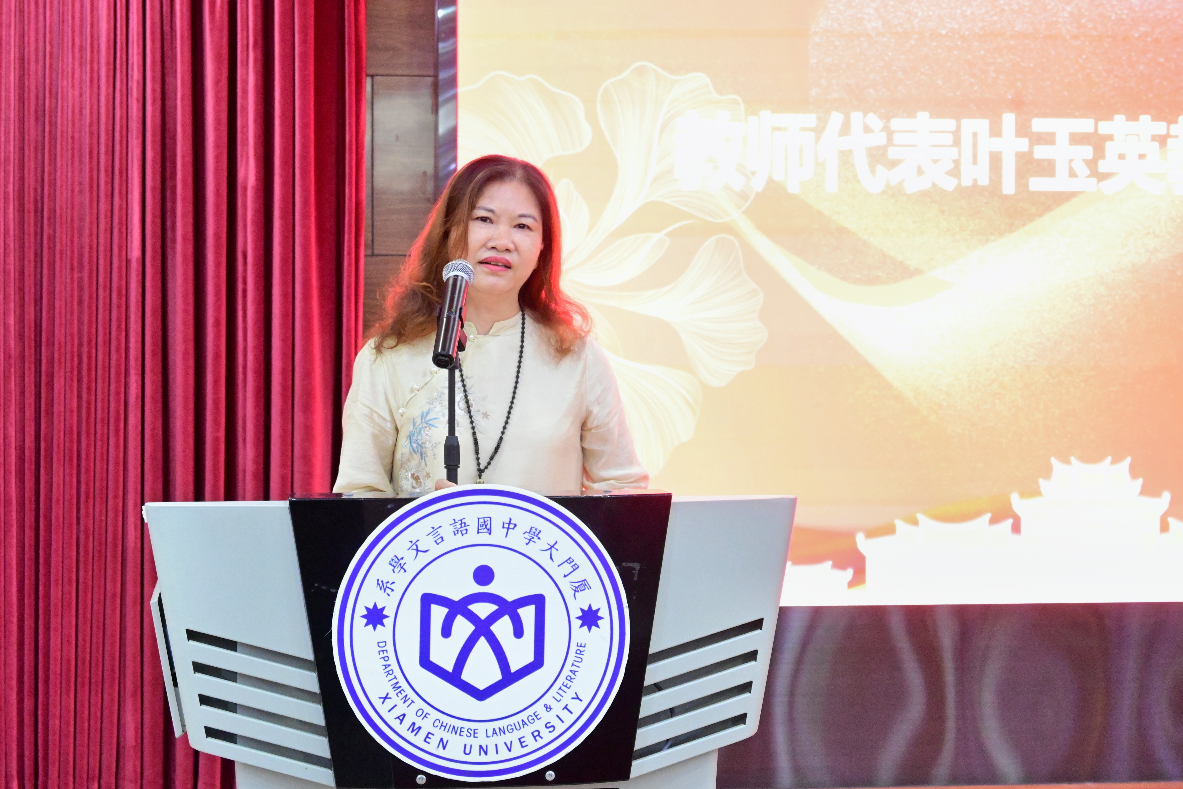 教师代表叶玉英教授希望同学们在团队中培养协作精神,尽早规划学习生涯,提高自己的科研能力。她鼓励同学们努力拓宽学术视野,积极参与讲座、学术会议、社会实践、田野调查等,开阔国际视野,站在学术前沿,与厦门大学同频共振,为实现自己的梦想不断前进。