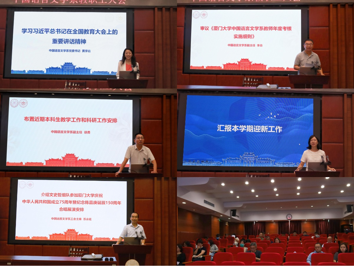 9月13日下午,厦门大学中国语言文学系教职工大会在南光楼101会议室召开,系领导班子和教职工参加会议。大会由中文系办公室主任哈飞飞主持。