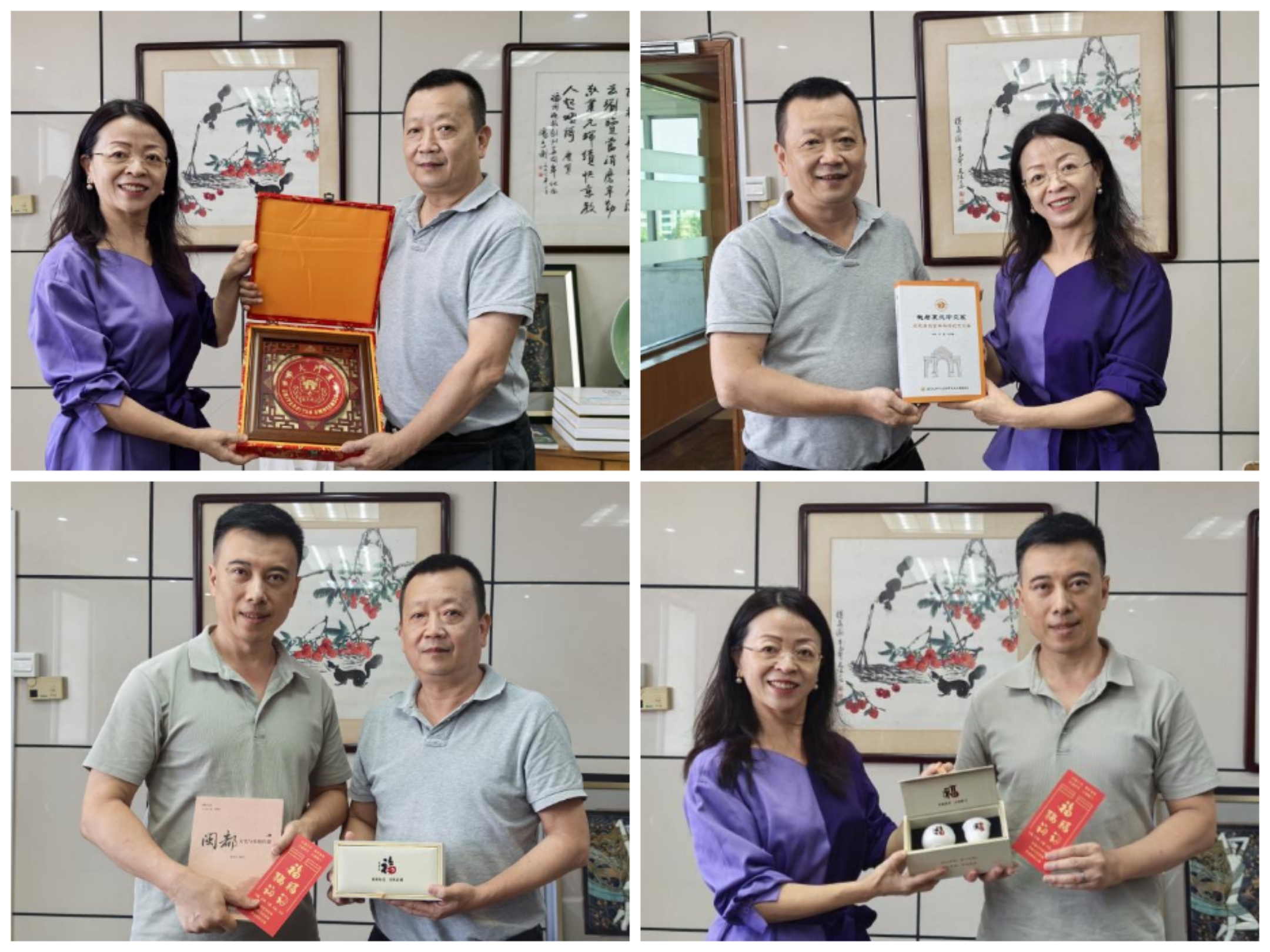 黄宇霞向各位系友介绍了中文系组织架构、师资力量、学生培养与发展等方面的现状,对系友们对母系发展的关注和支持表示衷心的感谢。与会系友纷纷回忆起在中文系求学的岁月,表示在中文系学习打下的扎实的专业基础以及培养的核心语言文字素养,都在日后工作中发挥了重要作用,同时谈及在中文系参与社团活动、创办报刊等的经历,表达了对母校、母系的感恩之情,系友们也对中文系未来发展提出了许多建设性意见。交流活动气氛温馨,其乐融融。陈骋学长代表系友向母系赠送了其父亲陈章汉经典手书福文创双福礼杯,祝福母系发展“满满福气”,蒸蒸日上。