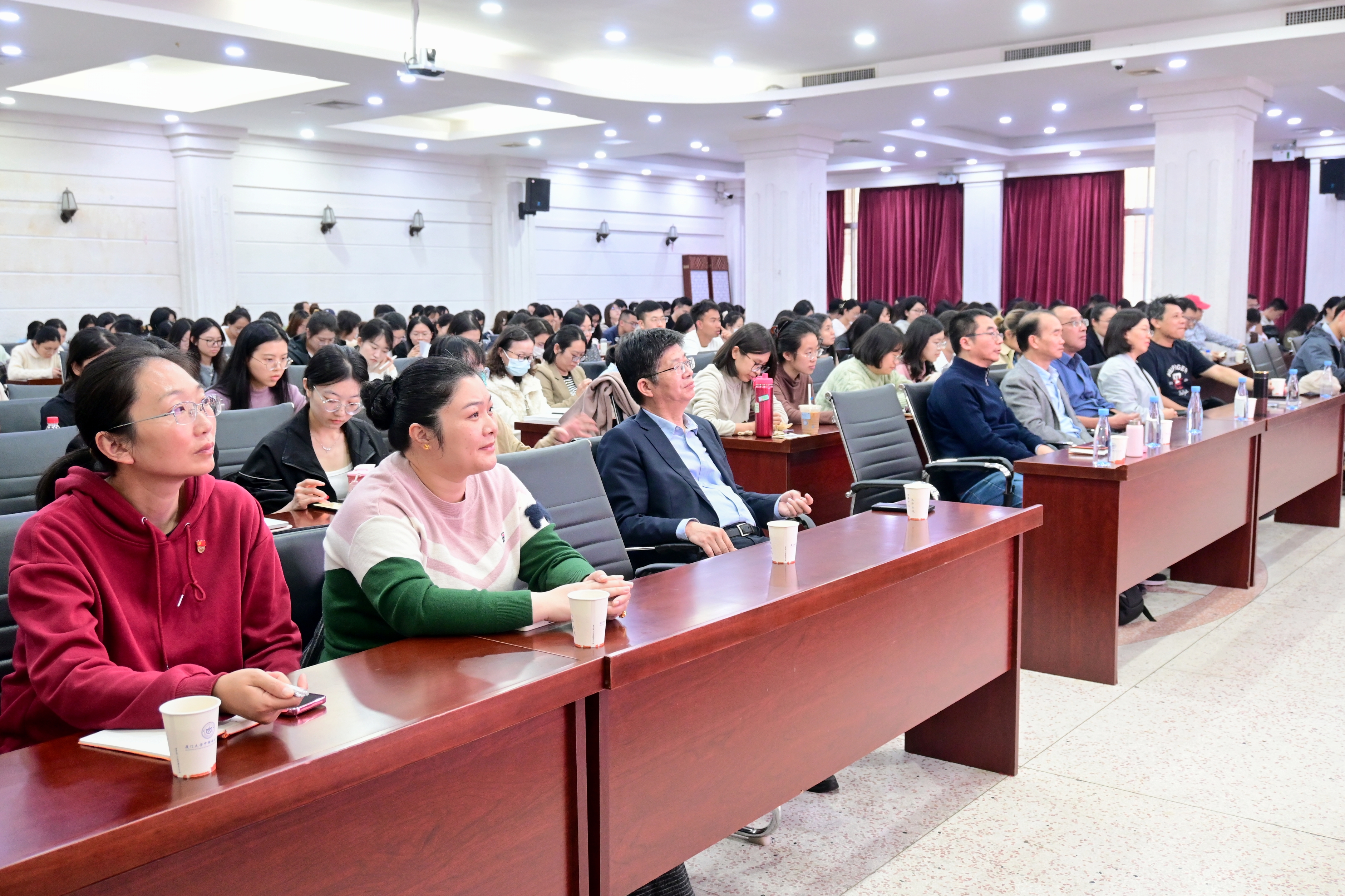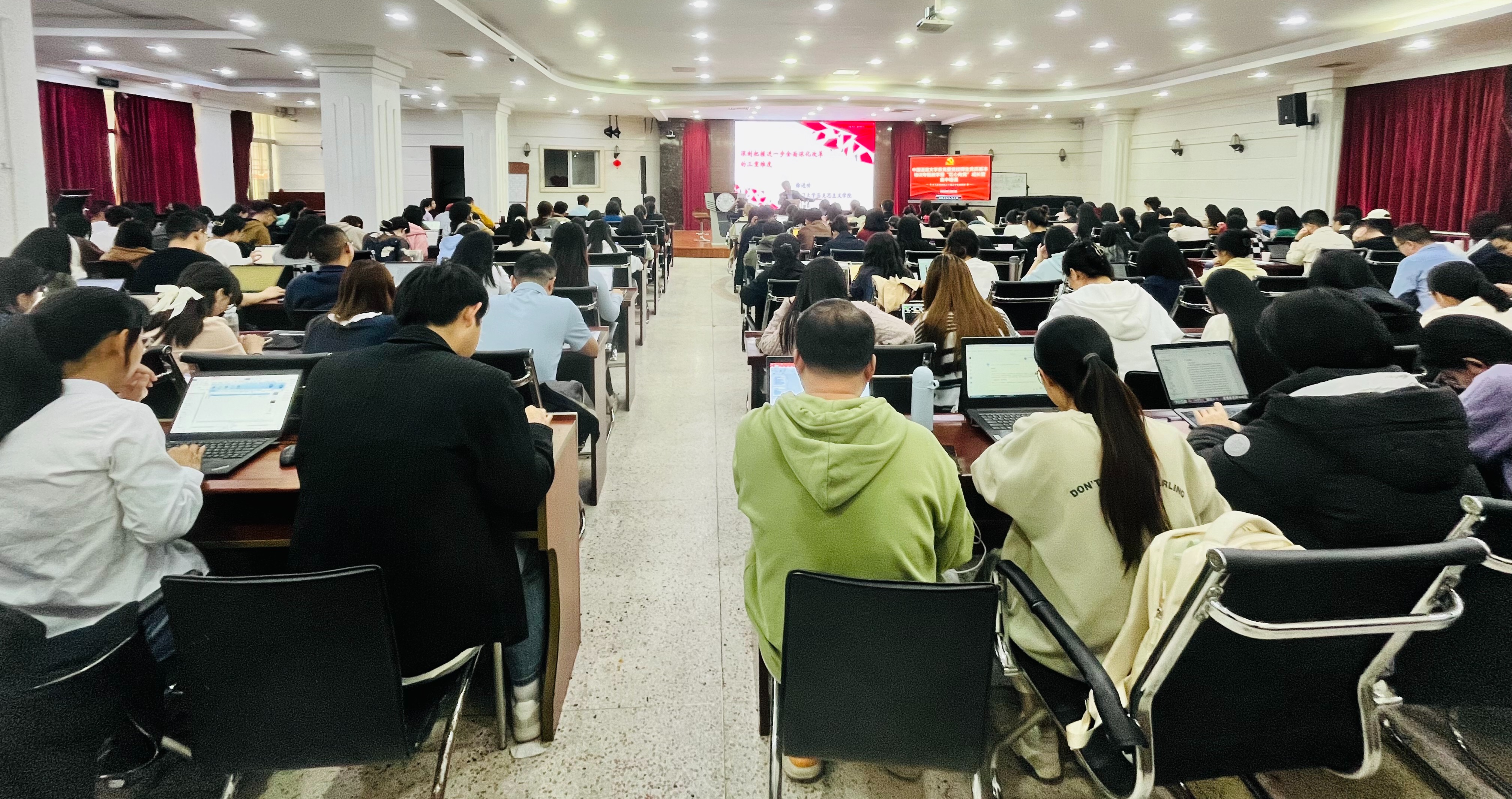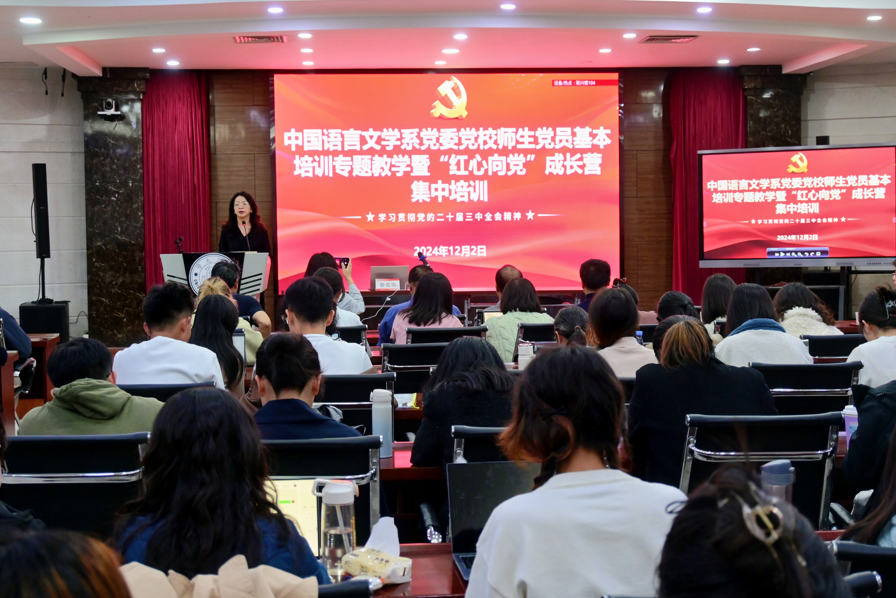 为深入学习贯彻党的二十届三中全会精神,落实学校党委关于党员教育培训工作的要求,12月2日下午,中文系于联兴楼多功能厅开展师生党员基本培训专题教学暨“红心向党”成长营集中培训。系党政领导班子成员、全系教职工、学生党员、“红心向党”成长营之学生入党积极分子近300人参加学习。培训由党委书记黄宇霞主持。