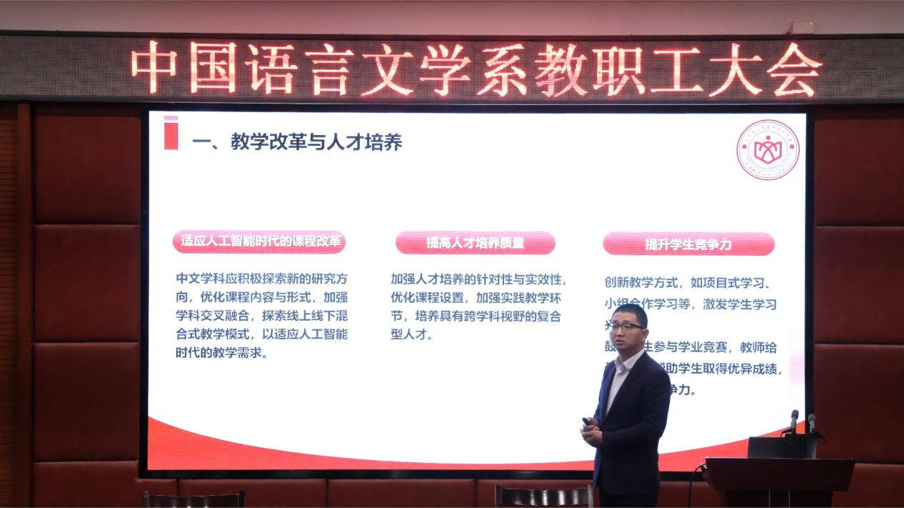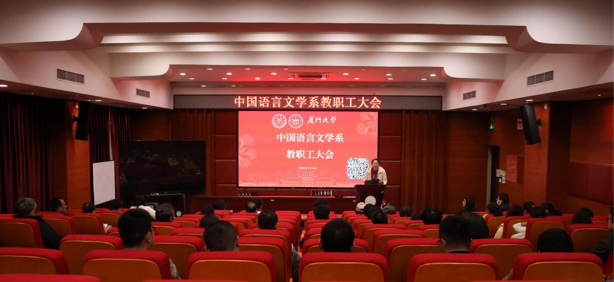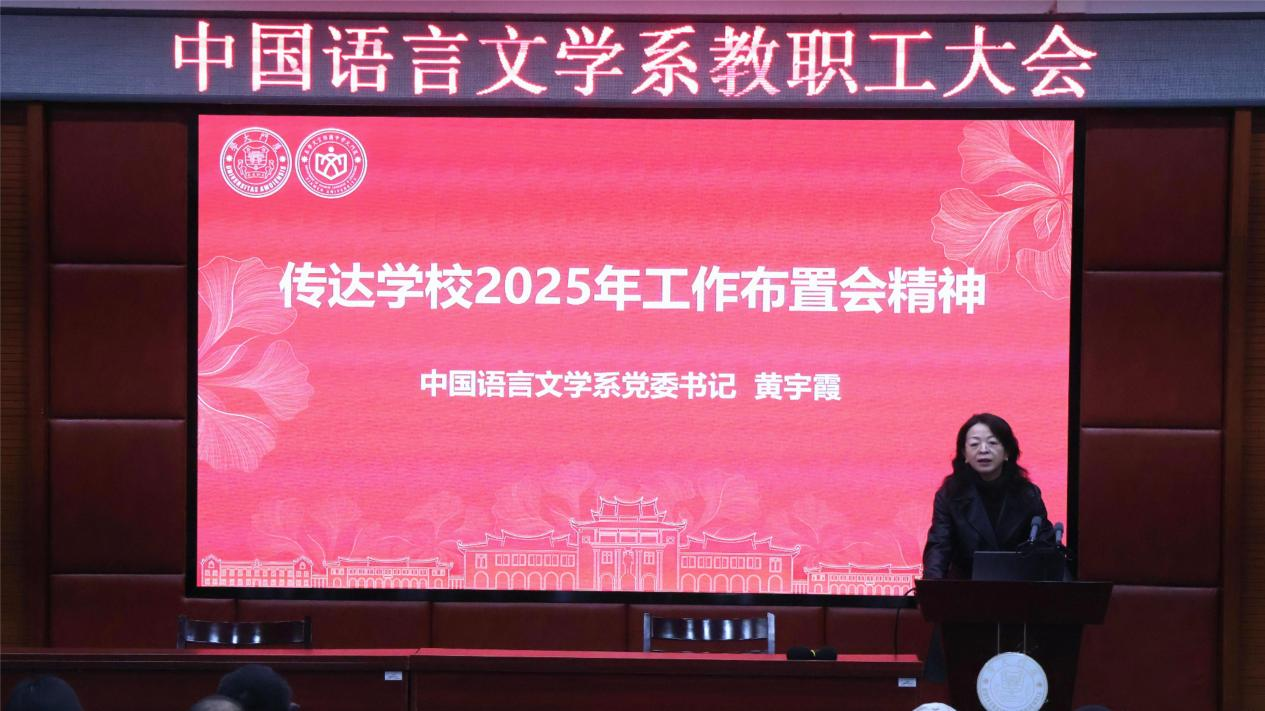 2025年2月24日下午,中国语言文学系在南光楼101会议室召开全体教职工大会。系领导班子和全体教职工参加会议,大会由系办公室主任哈飞飞主持。