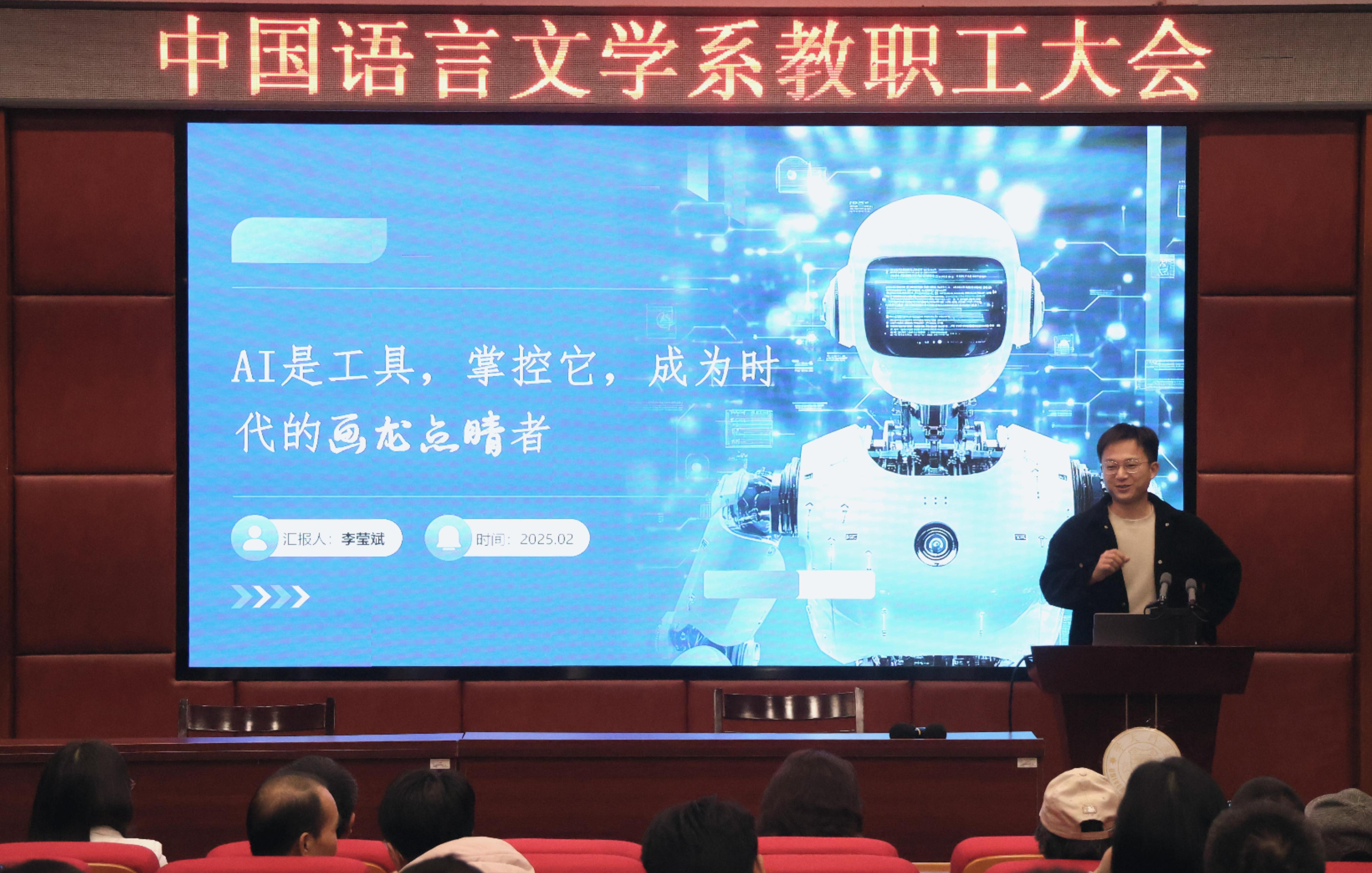 系辅导员李莹斌向大会详细介绍了DeepSeek使用指南,并从文稿写作、视频生成、论文创作等方面切入,结合具体的案例演示,展示了DeepSeek作为辅助工具在教学科研以及管理服务中发挥的作用。他指出,智能时代的到来,对人文学科的发展既是挑战又是机遇,全体中文人应密切关注AI发展,熟悉利用这一技术,助力教学科研管理等工作提质增效。