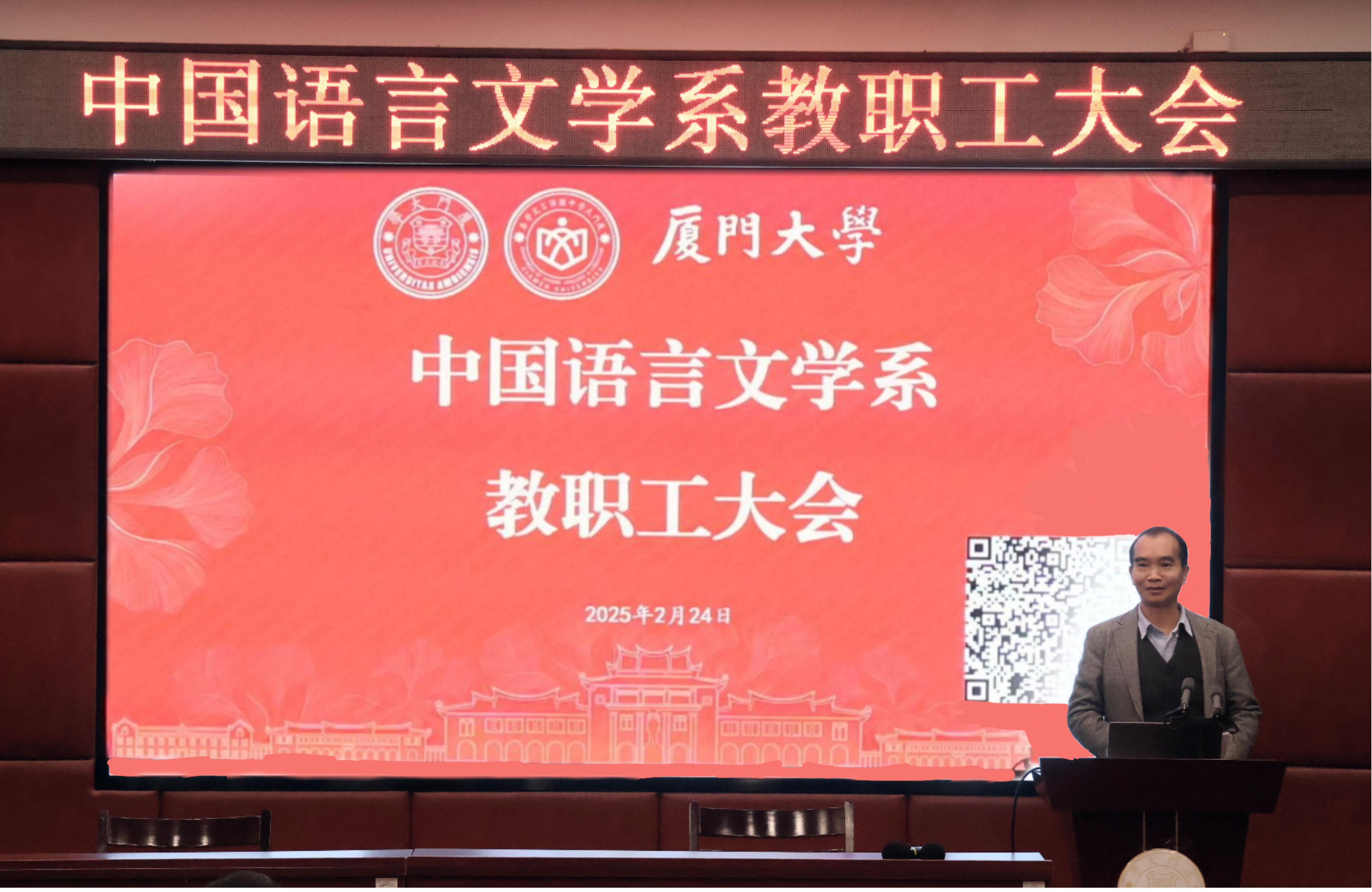 系主任徐勇汇报了系春季工作研讨会议情况与2025年重点工作。他指出,在前期中文学科高质量大讨论的基础上,中国语言文学系召开首次春季研讨会,全系上下对发扬学科优势、加强交叉融合,走出一条独具厦大中文学科特色的发展之路统一了认识形成了共识,为今后各项事业发展奠定基础。他强调,中国语言文学系要主动适应智能时代的发展,深化课程改革,提高人才培养质量,提升学生竞争力。对于保持和增强系的科研优势,他提出要加强国家级人才和青年骨干人才的引育,应对国家战略要求,发挥学术团队的引领作用,有组织开展科学研究。同时,还要不断扩大系国内外学术“朋友圈”,加强与海内外顶尖高校中文学科的合作交流。此外,徐勇还就编撰中文学科百年发展史、推进《大学语文》课程改革、开展系学术团队和重大项目培育支持计划、加强年度人才引进、提升党政服务效能等重点工作进行具体布置。