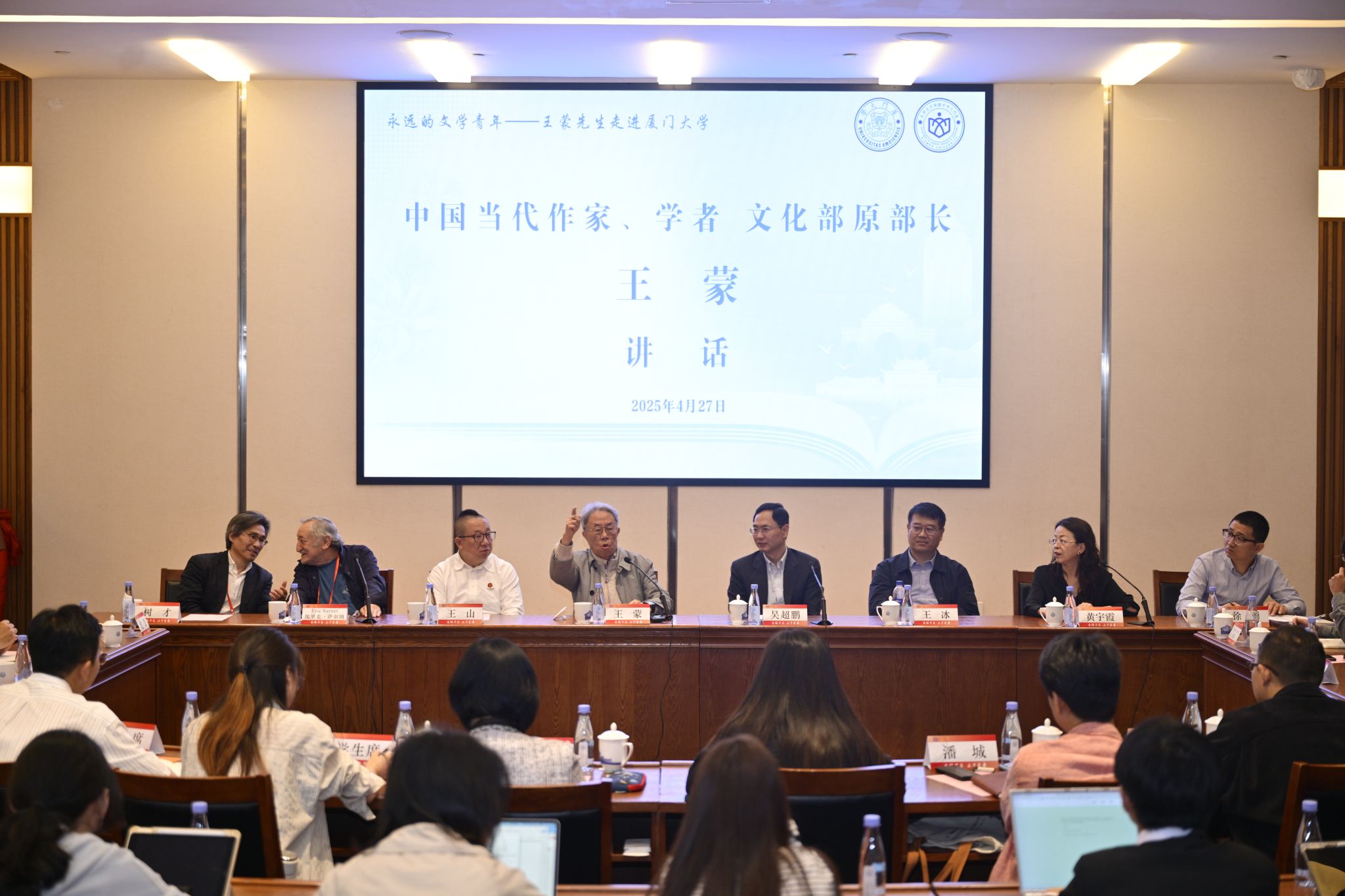 已91岁高龄的中国当代著名作家、学者,原文化部部长、被授予“人民艺术家”国家荣誉称号的王蒙,携夫人单三娅以及数十位来厦参加第十一届鼓浪屿诗会的中外诗人,于4月27日上午走进厦门大学,以“永远的文学青年”为主题与师生展开座谈交流。厦门大学党委常委、副校长吴超鹏,中国语言文学系主任徐勇出席。座谈会由中国语言文学系党委书记黄宇霞主持。