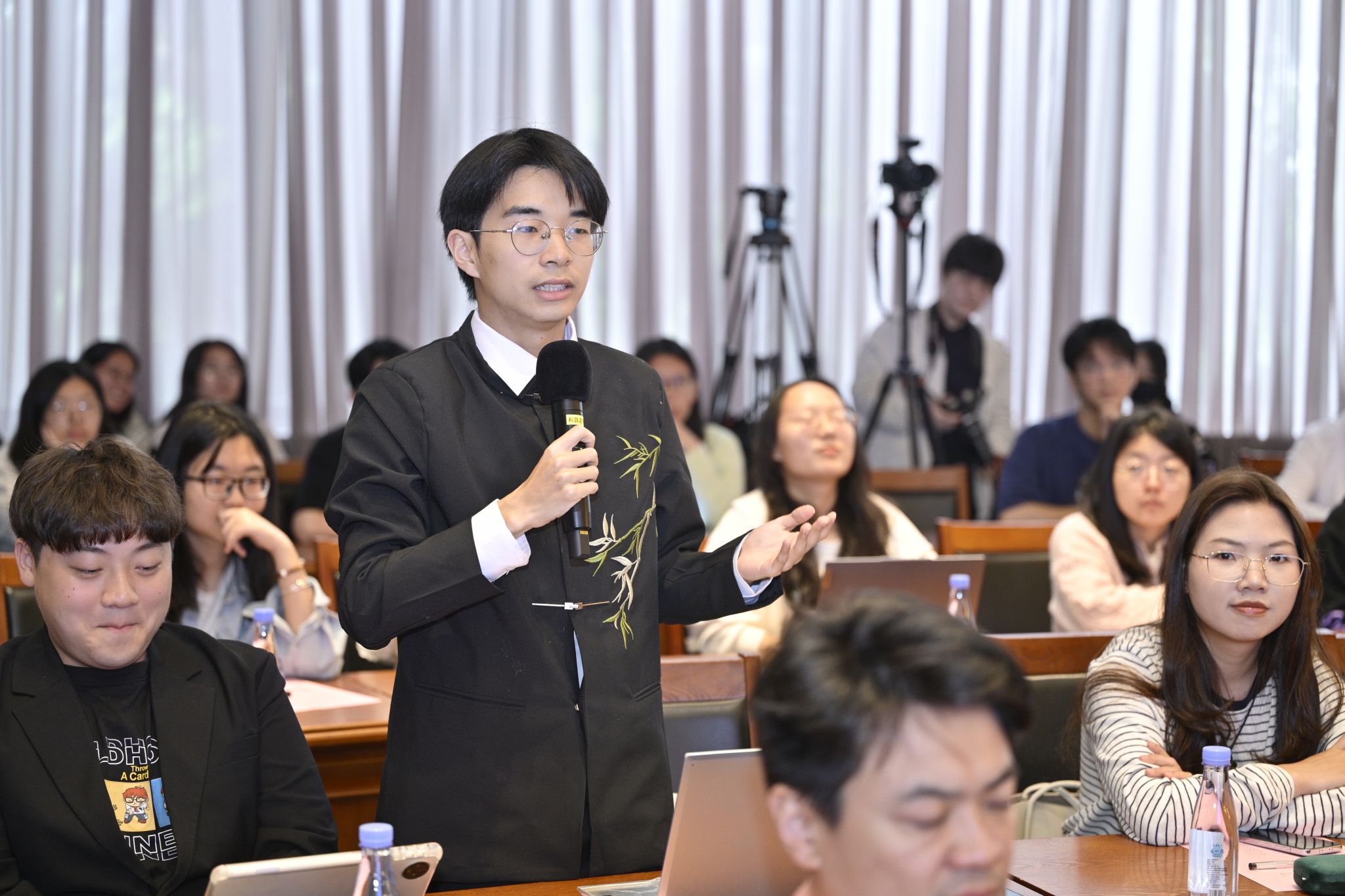 之后,王蒙与同学们开展了亲切而热烈的互动交流。朝气蓬勃的厦大同学们与平易近人的王蒙先生一见如故,将青春的思索、写作的疑惑、文学的思考向他倾诉。王蒙先生认真听取了同学们的提问,给出了幽默、睿智、有深度的回答。面对提问“您创作的文学形象是否常有生活中的原型?”,王蒙表示,既要尊重文学的现实主义,又要享受文学虚构的乐趣,若把注意力都集中在考证上,阅读小说的趣味可要大打折扣;一位同学困惑于,受生活阅历所限,自己的创作激情有余但深度不足,王蒙笑着说:“等你也到了90岁,再谈生活阅历也不迟吧!”引发了全场的笑声和掌声。王蒙补充道,文学本就是百花齐放,能够超出现实的,生活经验既是可以突破的、也是可以被创造的。还有同学问道:“文学青年应该是浪漫的,还是务实的?”王蒙主张,真正的文学青年没有规范、没有模型,只要永葆一颗青春的心和对文学的赤诚,就是“永远的文学青年”,但要记得把身体、心灵、精神的健康放在第一位,在热情洋溢中也保有一定的分寸感,幸福而快乐地读书、成长。现场金句频出,笑声、掌声如潮水般此起彼伏,70岁的“最萌年龄差”被一颗颗不老的诗心轻松跨越。