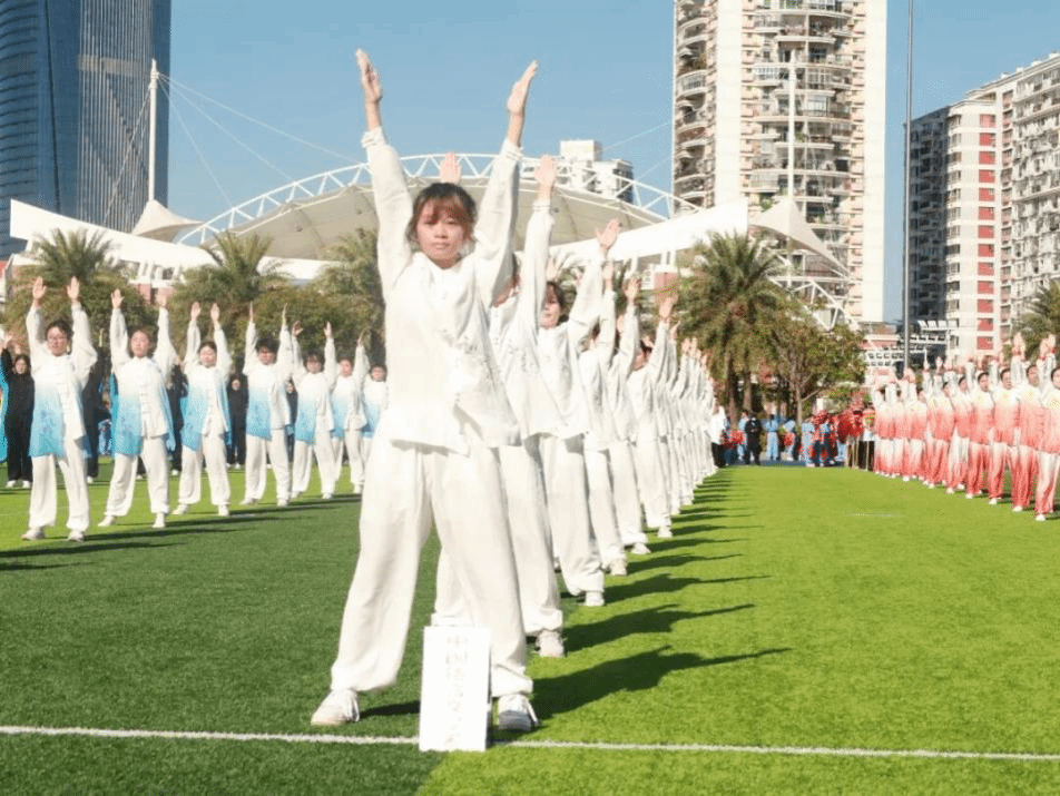 天似碧幕,草如绿茵,中文系八段锦队伍动作整齐、舒展自如。一招一式,外显柔和;一呼一吸,内蕴精神。形松意紧,神与形合,尽显中华传统养生之道的从容气度。