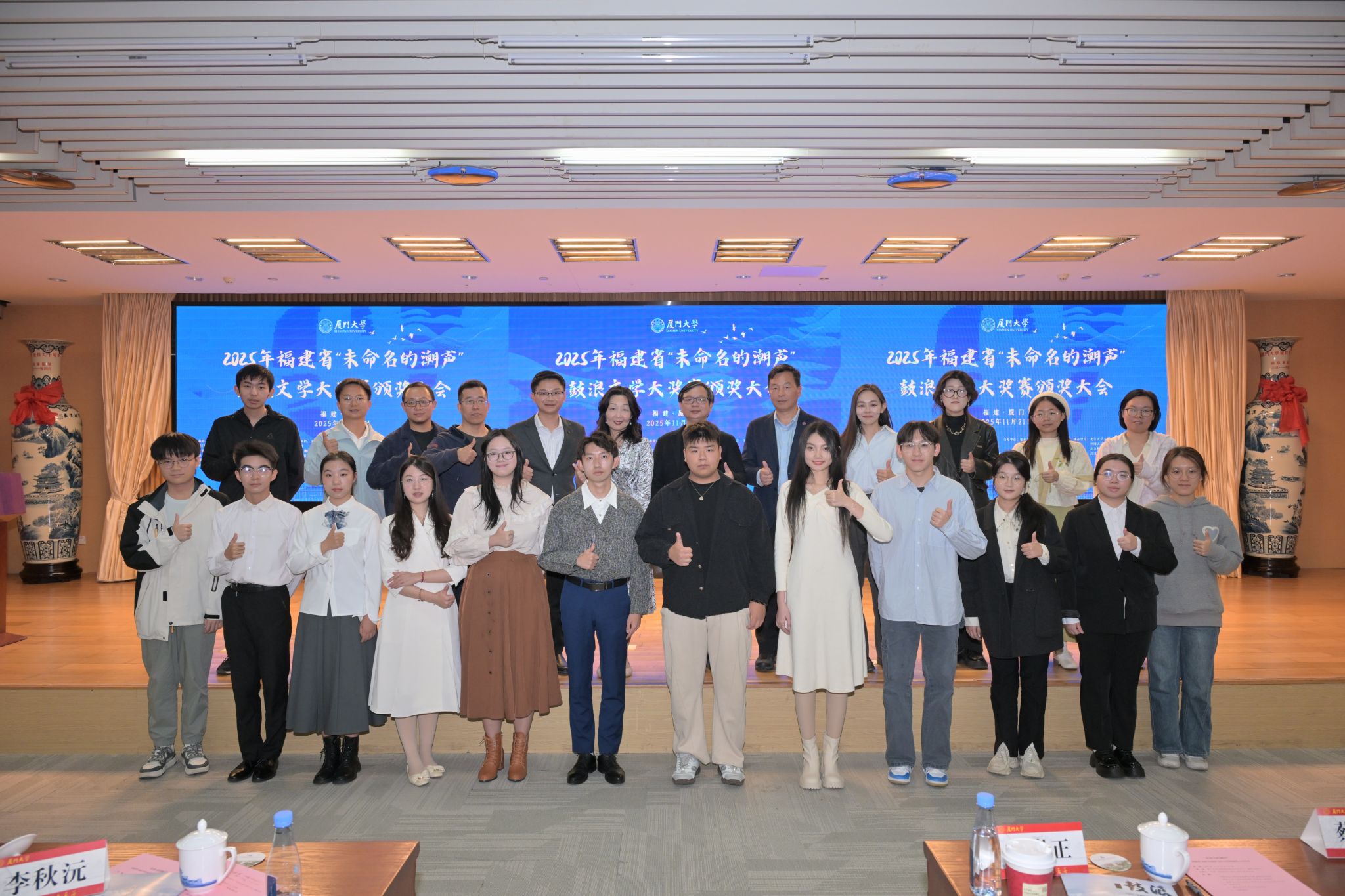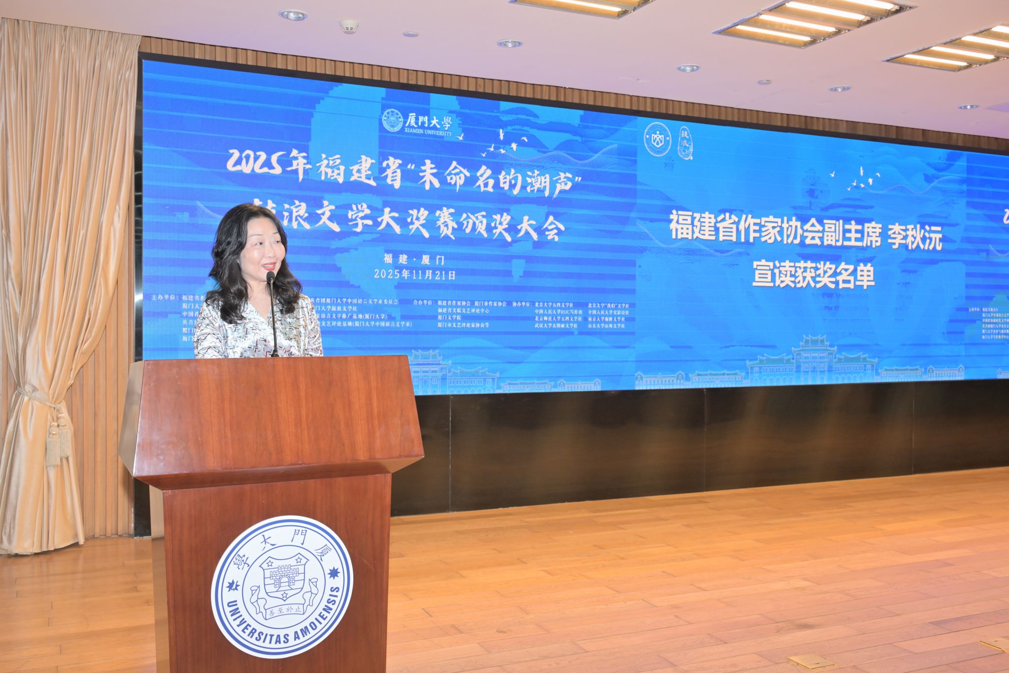 11月21日下午, 2025年福建省“未命名的潮声”鼓浪文学大奖赛颁奖仪式,在厦门大学思明校区科学艺术中心多功能厅顺利举行。福建省作家协会副主席、儿童文学作家李秋沅,特邀嘉宾、广州市作家协会副主席陈崇正,共青团厦门大学委员会副书记郭江淮,中国语言文学系党委副书记蔡虎堂,美育与通识教育中心秘书李仕耘,鼓浪文学社指导老师、中国语言文学系助理教授胡行舟,中国语言文学系助理教授刘晓宇,以及获奖选手代表、鼓浪文学社社员和厦门大学文学爱好者共同出席。仪式由中国语言文学系2023级本科生冯源主持。
