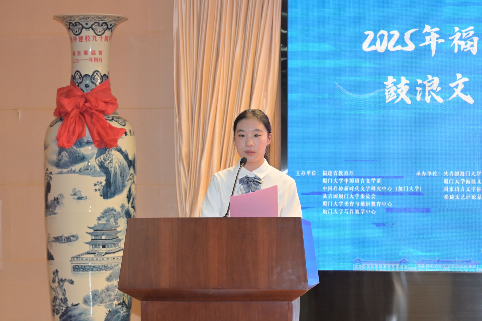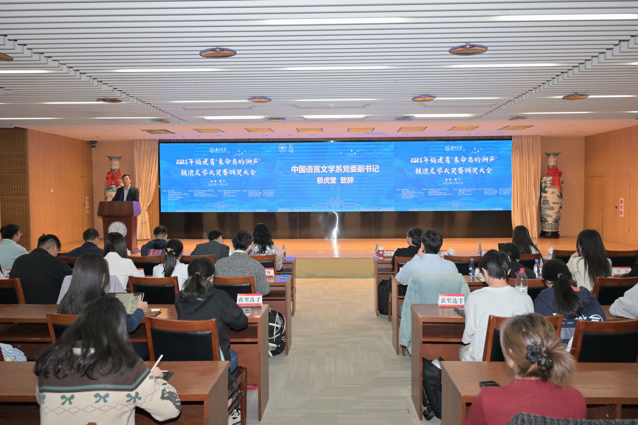 中国语言文学系党委副书记蔡虎堂为颁奖仪式致辞。他首先代表中文系向获奖同学表示热烈祝贺,并向所有支持本次大赛的师生同仁致以诚挚感谢。蔡虎堂回顾了由鲁迅先生亲手创办的鼓浪文学社与厦大中文系之间深厚的文学渊源。他指出,鼓浪文学大奖赛正是这一文脉在当代的生动延续,已成为激励青年书写时代、涵养心灵的重要平台。他强调,在坚定文化自信、推进文化强国建设的时代背景下,青年创作者应自觉肩负使命,将个人艺术追求融入时代洪流,用有温度、有格局的精品力作讲好中国故事,为社会主义文化繁荣发展贡献青春力量。