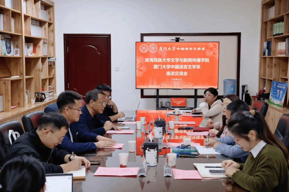 青海民族大学文学与新闻传播学院学科负责人桑吉东知、博士点建设负责人张涛、实验室负责人江鎏渤,厦门大学中国语言文学系胡旭教授、本科教学秘书韩璟、研究生教学秘书林慧玲参加座谈,双方就人才培养、博士点建设、科研平台建设等方面展开了热烈的交流和研讨。