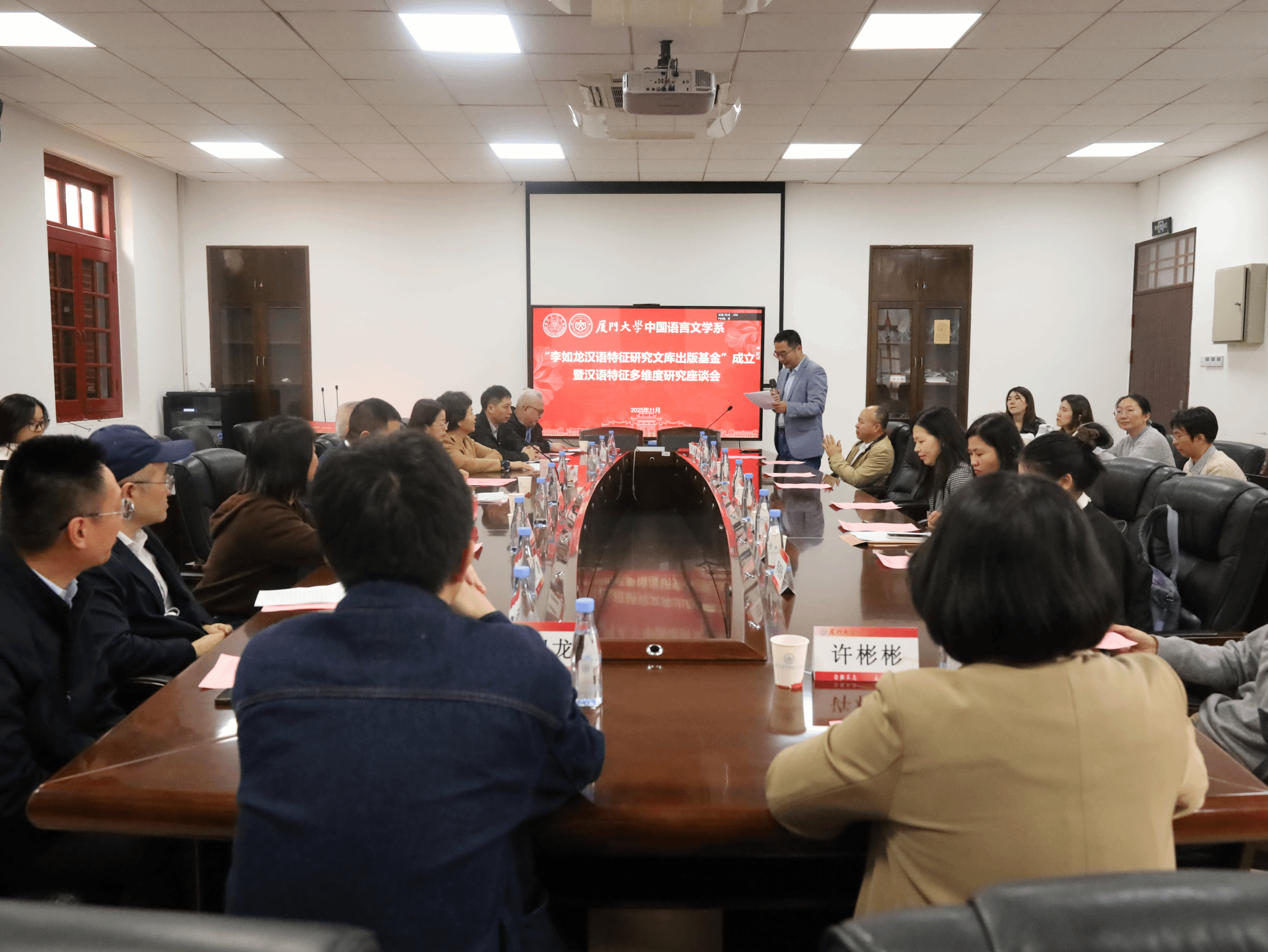 11月20日上午,“李如龙汉语特征研究文库出版基金”成立仪式暨汉语特征多维度研究座谈会在厦门大学南光楼一号楼320会议室隆重举行。著名语言学家、厦门大学荣休教授李如龙,全国汉语方言学会学术委员会副主任、浙江大学教授庄初升,中文系党委书记黄宇霞、系主任徐勇、厦门大学教育发展基金会副秘书长徐滨、厦门大学社科处副处长唐瑭、厦门大学离退休工作部部长曾坤瑜、厦门大学出版社党委书记张伟以及师生代表等共同出席。成立仪式由系副主任李焱主持。