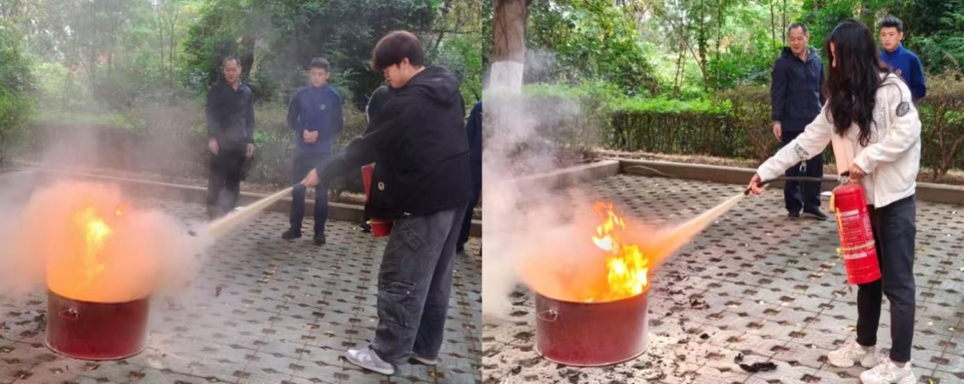 培训的最后,全体师生移步到联兴楼门口空地进行户外灭火器实操演练。在沈耀老师的指导下,同学们积极参与,依次练习“提、拔、握、压”的操作步骤,最终将消防知识转化为了实际技能。