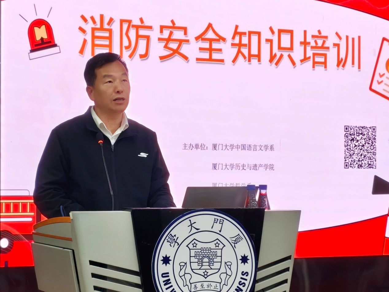 为筑牢校园安全防线,切实增强学生的消防安全意识与防范能力,有效避免各类火灾事件的发生,12月25日下午,中国语言文学系联合历史与文化遗产学院和哲学系在联兴楼多功能厅开展消防安全知识培训。本次培训特别邀请厦门市思明区厦港消防救援站班长沈耀老师主讲。中文系党委书记黄宇霞及三家单位师生参与培训。培训由中文系党委副书记蔡虎堂主持。