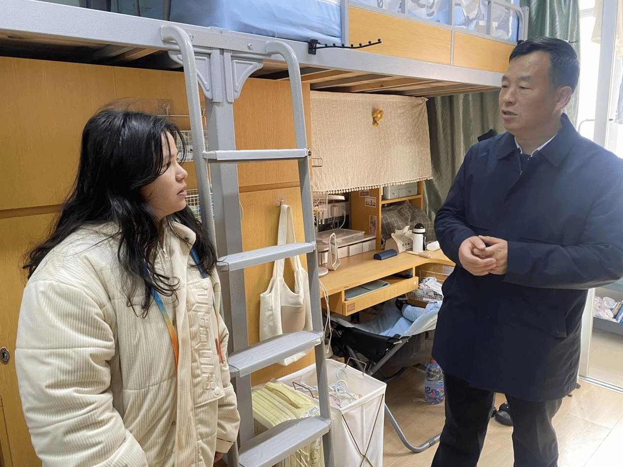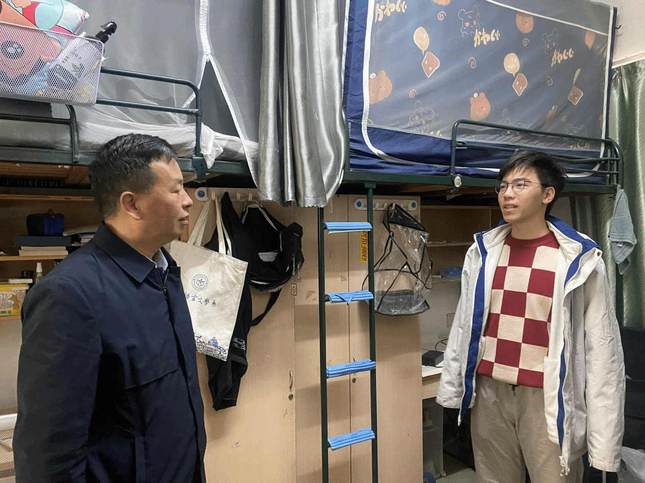 1月23日上午,中文系党委副书记蔡虎堂与辅导员李莹斌深入留校学生宿舍走访慰问,详细了解同学们的留校生活与需求,并叮嘱大家注意消防安全与假期防护,将关怀落到实处。