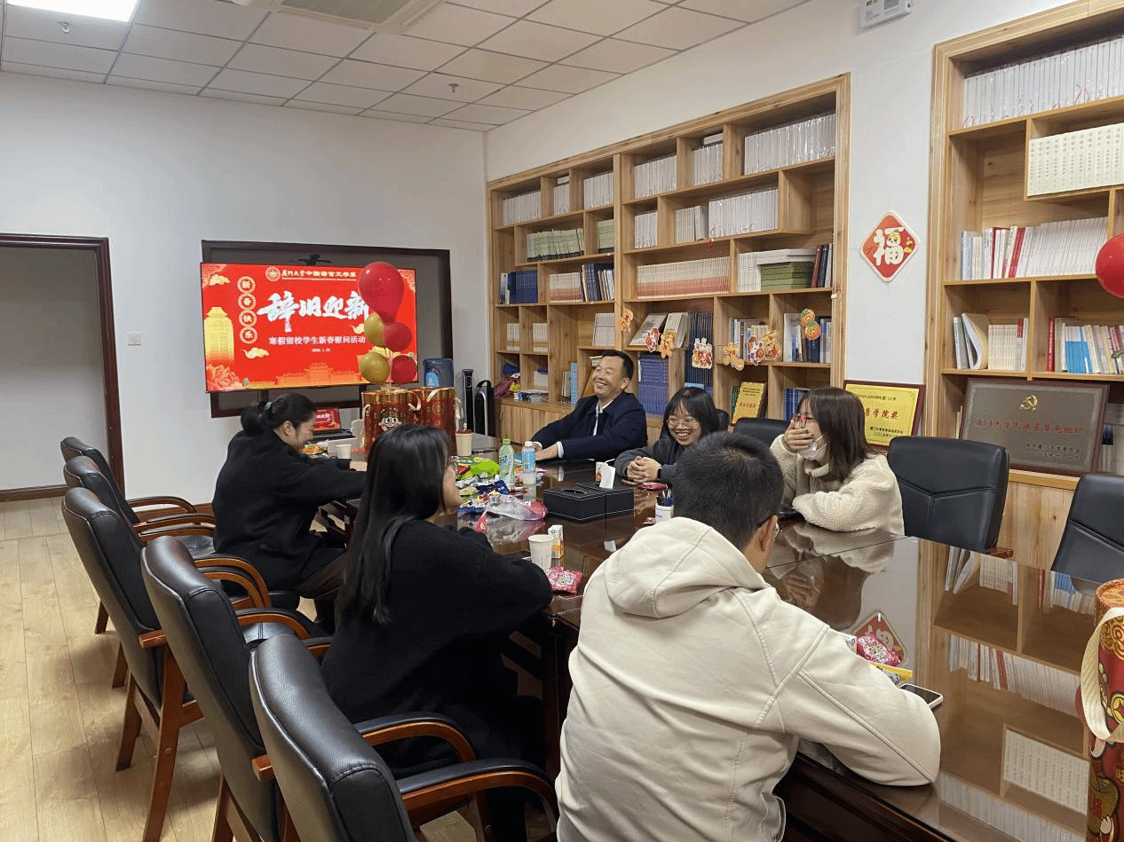 1月25日上午,“辞旧迎新”新春慰问活动在同一地点温情举行。蔡虎堂、林慧玲、吕凤楠、李莹斌与留校学子围坐交流,倾听大家的心声与诉求,并送上诚挚的新春祝福。活动中,老师们为同学们发放新年零食大礼包,并一同观看学校新春团拜会直播,现场洋溢着浓厚的节日氛围。