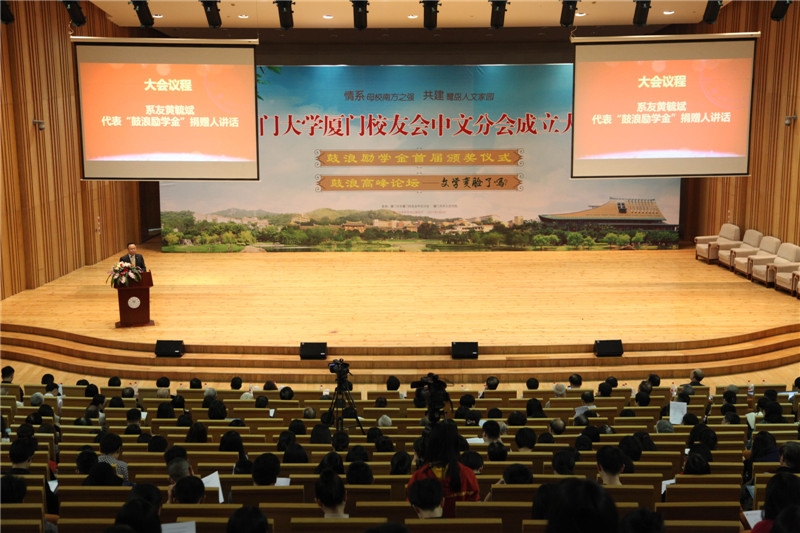 本次大会还创立了 “鼓浪励学金”。中文系系主任李无未教授代表中文系接受捐赠,教育发展基金会办公室副主任赵晓慧为校友代表颁发捐赠证书。2014级中文系本科生孙培婷等15位学生及团体成为首届获得者。系友代表黄毓斌等为他们颁发荣誉证书。“鼓浪励学金”是由中文系校友自主发起的助学善意行动,它缘起于95周年校庆期间,旨在支持厦门大学人文学院教育事业的发展,促进在创新、创作、创业、访学交流、志愿服务等方面表现优异的学生成长成才。这是首次以院系各年级为单位发起和设立的励学金基金,首期由中文系1977级至1990级14个年级的校友共同发起设立。