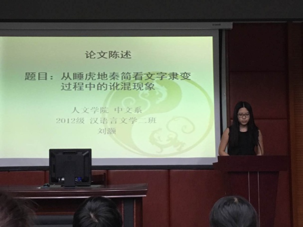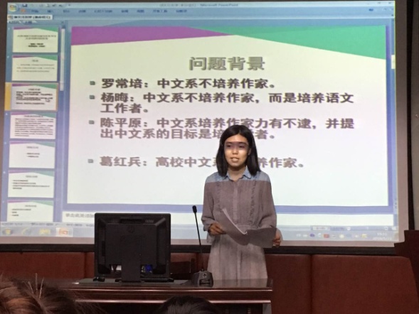 2012级本科生优秀毕业论文答辩由中文系副主任王晓红主持,参与学生主要为即将进入大四的2013级中文系本科生。来自语言文字学、汉语言文学、戏剧影视文学三个专业方向的洪迎华、仲霞、赵春宁、李天、张惟捷、夏光武、张治、赵明等8位老师担任答辩评委出席答辩会,8名本科生优秀毕业论文作者进行了论文答辩。其中,古代文学组的刘美惠同学,以其深厚的学术功底与出色的思辨能力,赢得了答辩老师的好评;戏剧戏曲组的廖智敏同学,将实践与学术研究相结合,认真、踏实的学术态度得到了老师的充分肯定;应用语言学组的王皓�同学,其大数据分析与语言学研究结合的创新研究方法也深为老师所赞许。